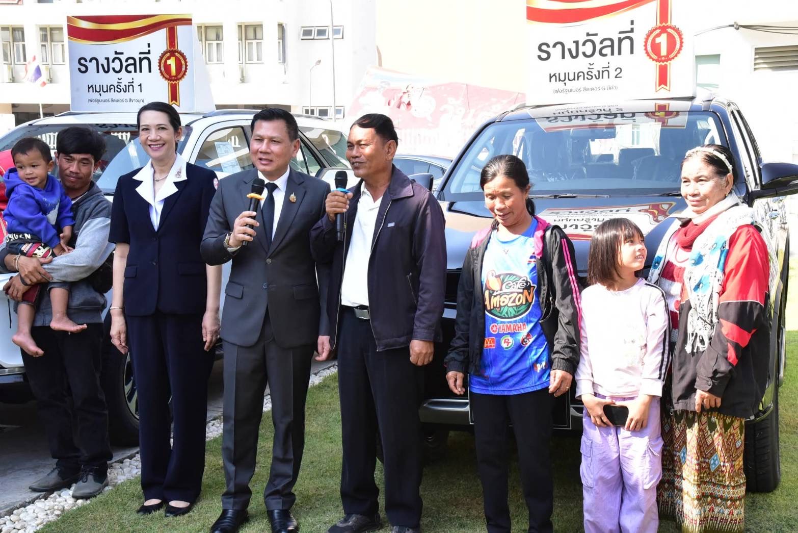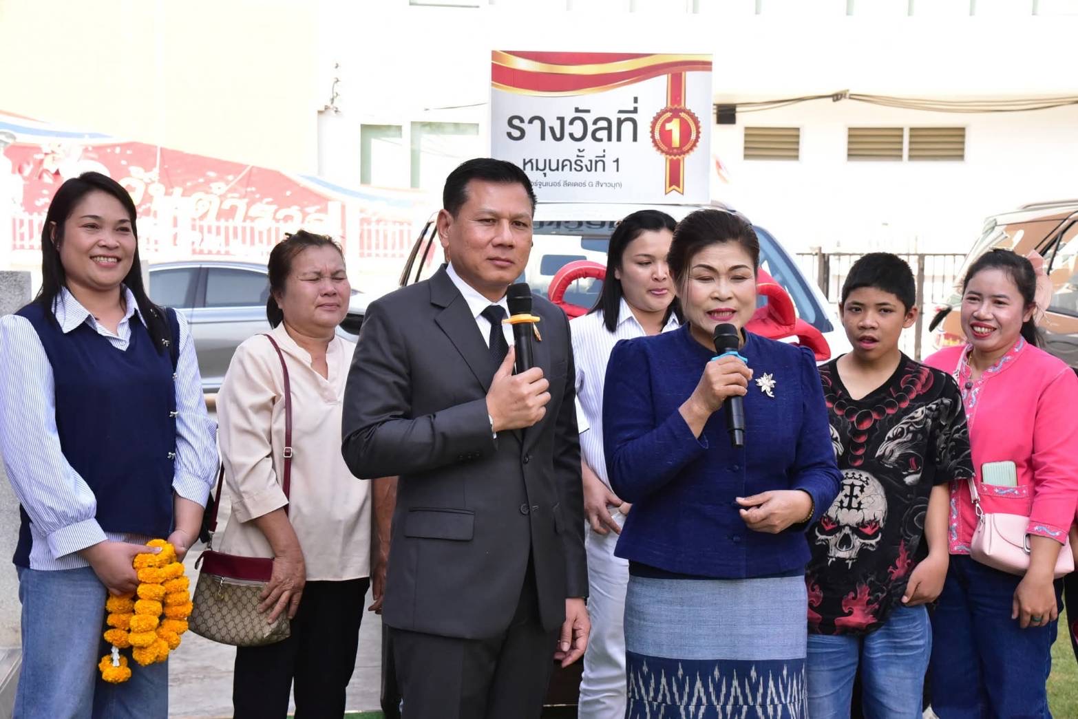 .รางวัลที่ 1 (หมุนครั้งที่ 2) รถโตโยต้า ฟอร์จูนเนอร์ ลีดเดอร์ G สีดำ มูลค่ารางวัล 1,400,000 บาท ได้แก่ นายสินทรัพย์ เชื้อคำฮด ประธานกองทุนหมู่บ้านหนองหมู ตำบลพังแดง อ.ดงหลวง จ.มุกดาหาร