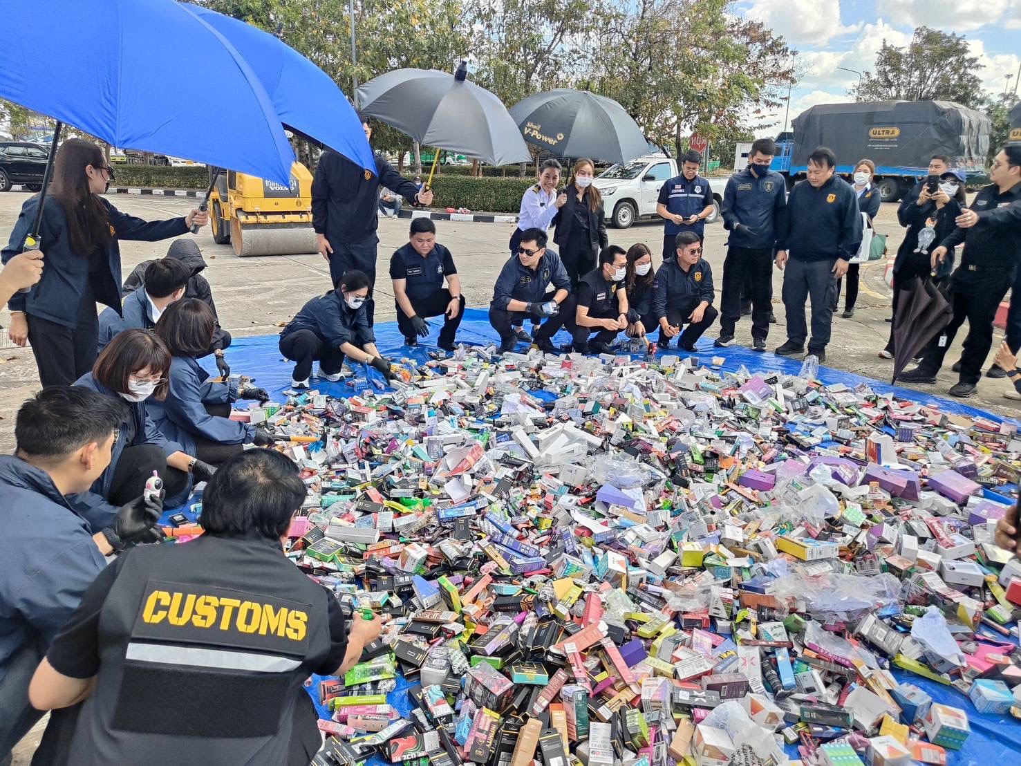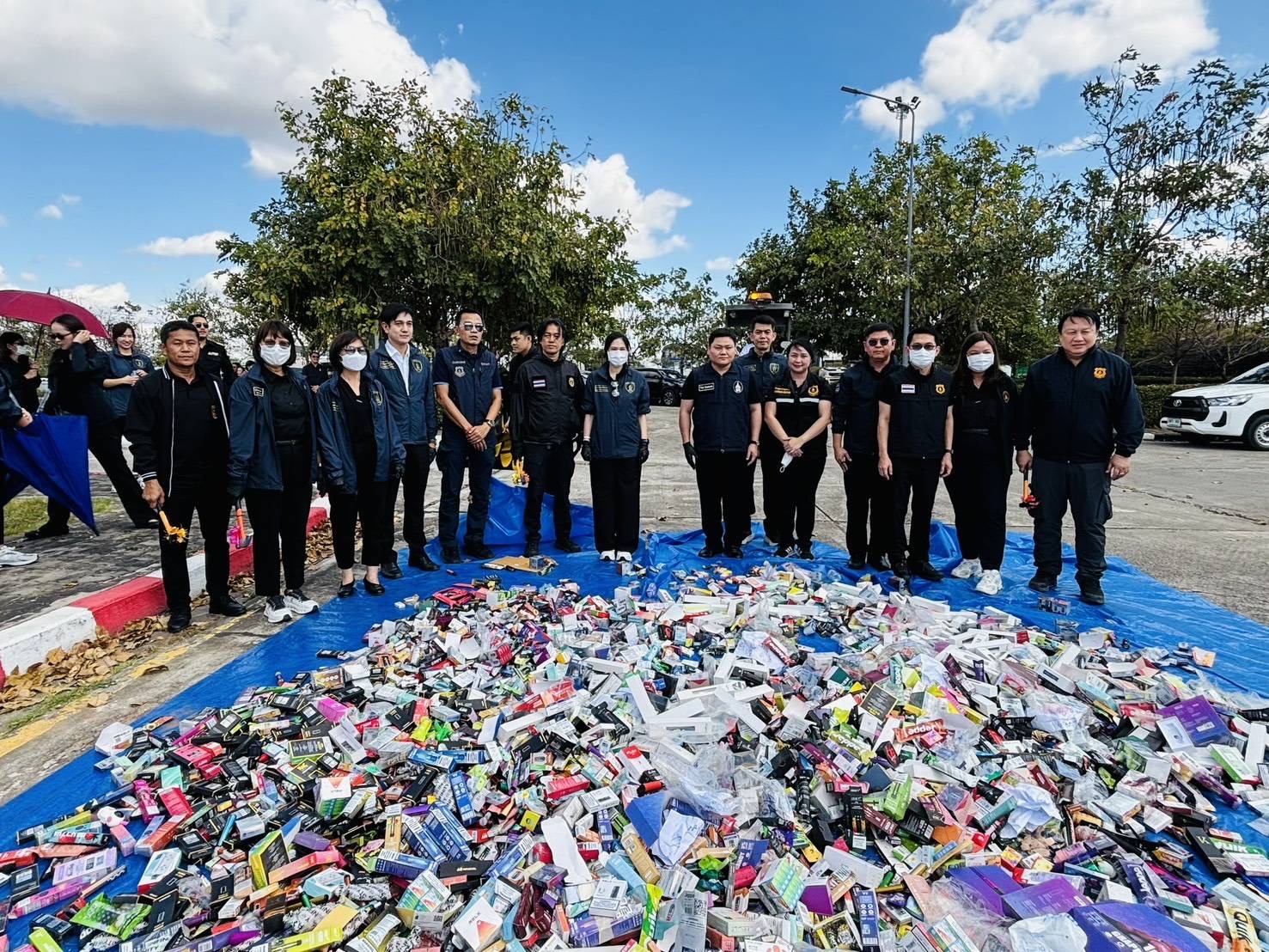 ร่วมกันทำลายของกลาง ประเภทบุหรี่ไฟฟ้า น้ำยาบุหรี่ไฟฟ้าและส่วนประกอบบุหรี่ไฟฟ้า ไพ่พลาสติก วิตามิน ผลิตภัณฑ์อาหารเสริม ยาเพิ่มสมรรถภาพทางเพศ เครื่องสำอาง ยากันยุง และขนมอบกรอบ มีจำนวนรวม 80 คดี รวมมูลค่า 3,381,694.90 บาท การทำลายโดยวิธีการบดทำลายเพื่อไม่ให้สามารถนำกลับมาใช้งานได้อีก ณ ลานหน้าอาคารด่านศุลกากรมุกดาหาร อำเภอเมืองมุกดาหาร จังหวัดมุกดาหาร