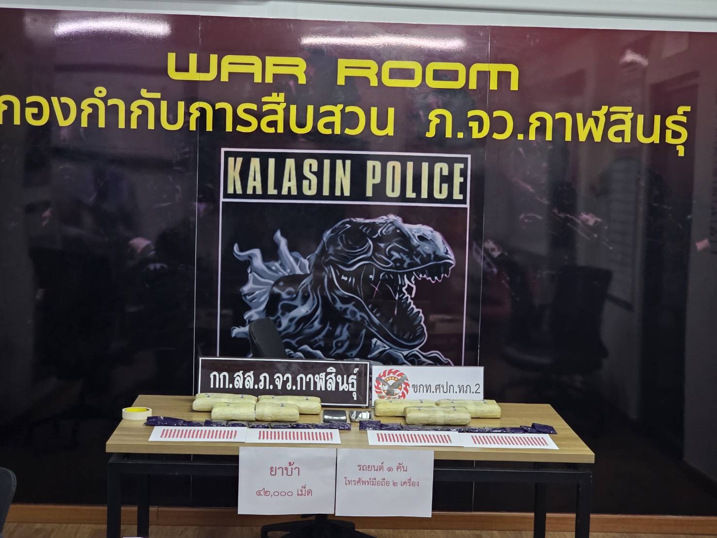 24 มกราคม 2569 ร.ต.อ.สรัศฑัศ ดาทุมมา รอง สว.กก.สส.ภ.จว.กาฬสินธุ์ พร้อมชุด ปส. ได้ร่วมกันจับกุมนายพิษณุ ชูชาวนา อายุ 35 ปี อยู่บ้านเลขที่ 195 ม.2 ตำบลบ้านเป็ด อ.เมืองขอนแก่น จังหวัดขอนแก่น พร้อมของกลางยาบ้า 42,000 เม็ด รถยนต์ จำนวน 1 คัน ราคาประเมิน 800,000 บาท โทรศัพท์มือถือ จำนวน 3 เครื่อง