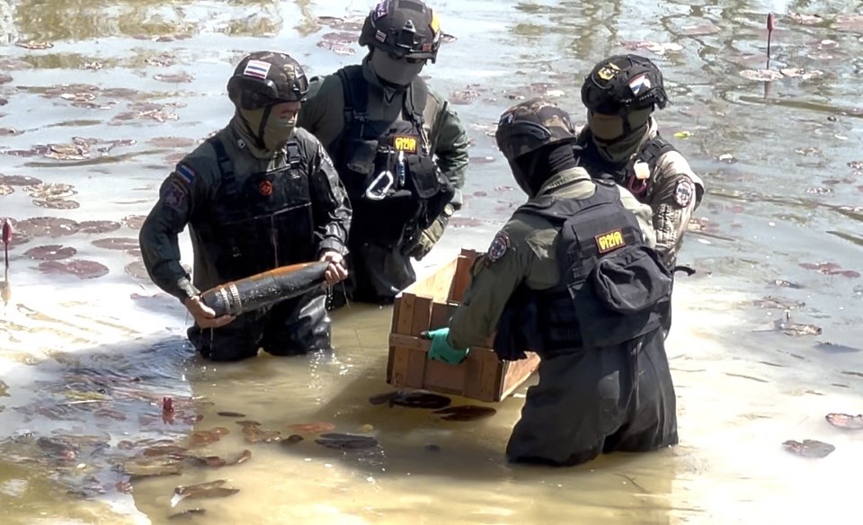 นายถนอม บัวต้น เจ้าของบ่อปลา ม.1 ต.เสาธงชัย อ.กันทรลักษ์ จ.ศรีสะเกษ กล่าวว่า สระน้ำตนเองซึ่งอยู่กลางทุ่งนา มีขนาดของสระกว้าง 20×20 เมตร น้ำลึกประมาณ 8 เมตร แต่ขณะนี้ระดับน้ำเพียงประมาณ 1 เมตร ตนได้ไปเหวี่ยงแหเพื่อจับปลาในสระน้ำ หลังจากที่ได้เหวี่ยงแหลงไปแล้ว จึงลงไปเพื่อคลำาหาตัวปลา แต่ปรากฎว่าพบวัตถุต้องสงสัยขนาดใหญ่ ไม่ใช่ตัวปลาอย่างแน่นอน เอามือลูบคลำดูมีลักษณะลื่นๆ เป็นนวัตถุขนาดใหญ่ สงสัยน่าจะเป็นลูกกระสุนปืน เพราะในช่วงที่มีการประทะกันมีกระสุนปืนตก บริเวณใกล้เคียงที่นาของตนจำนวนหลายลูก จึงทิ้งแหไว้ในสระน้ำ รีบขึ้นมาจากสระน้ำทันที และให้ผู้ท้องถิ่นทราบ แจ้งเจ้าหน้าที่ชุด EOD ลงไปตรวจสอบ