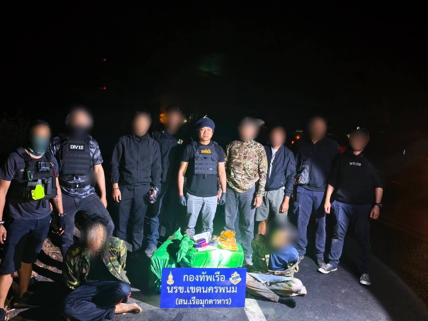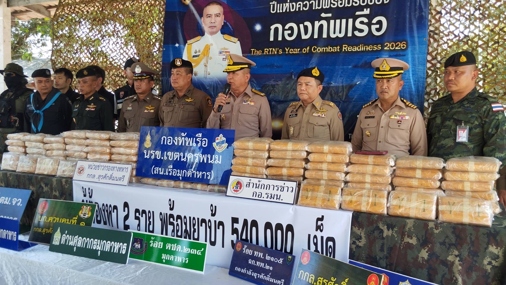 16 กุมภาพันธ์ 2569 พล.ร.ต.ณรงค์ เอมดี ผบ.นรข. นาย ชลิต ทิตย์คำ รองผู้ว่าราชการจังหวัดมุกดาหาร น.อ.แมนรัตน์ บุญสวัสดิ์ ผบ.นรข.เขตนครพนม น.ท.โอรส พุทธโค หน.สน.เรือมุกดาหาร พร้อมหน่วยงานความมั่นคง ร่วมกันแถลงข่าวจับกุมยาเสพติดให้โทษประเภท 1 (ยาบ้า) จำนวน 540,000 เม็ดหลังจากได้รับแจ้งจากสายลับซึ่งไม่ประสงค์ออกนาม (หวังสินบนรางวัลนำจับ) ว่าจะมีการลักลอบ รับ – ส่งยาเสพติดในพื้นที่รับผิดชอบ จึงได้จัดชุดชุ่มเฝ้าตรวจและลาดตระเวนทางบก ทำการลาดตระเวนในบริเวณพื้นที่ บ้านดอนตาลผาสุก ต.ดอนตาล อ.ดอนตาล จ.มุกดาหาร กระทั่งเวลาประมาณ 02.00 น. ชุดลาดตะเวนทางบกตรวจพบกลุ่มคนต้องสงสัย จำนวน 3 คน นั่งเฝ้าวัตถุต้องสงสัย บริเวณริมถนน หมายเลข 2074 บ้านตอนตาลผาสุก ต.ดอนตาล จ.มุกดาหาร เมื่อเห็นดังนั้น ชุดลาดตระเวนทางบกจึงเข้าแสดงตัวเป็นเจ้าหน้าที่ นรข.เพื่อเข้าตรวจสอบ