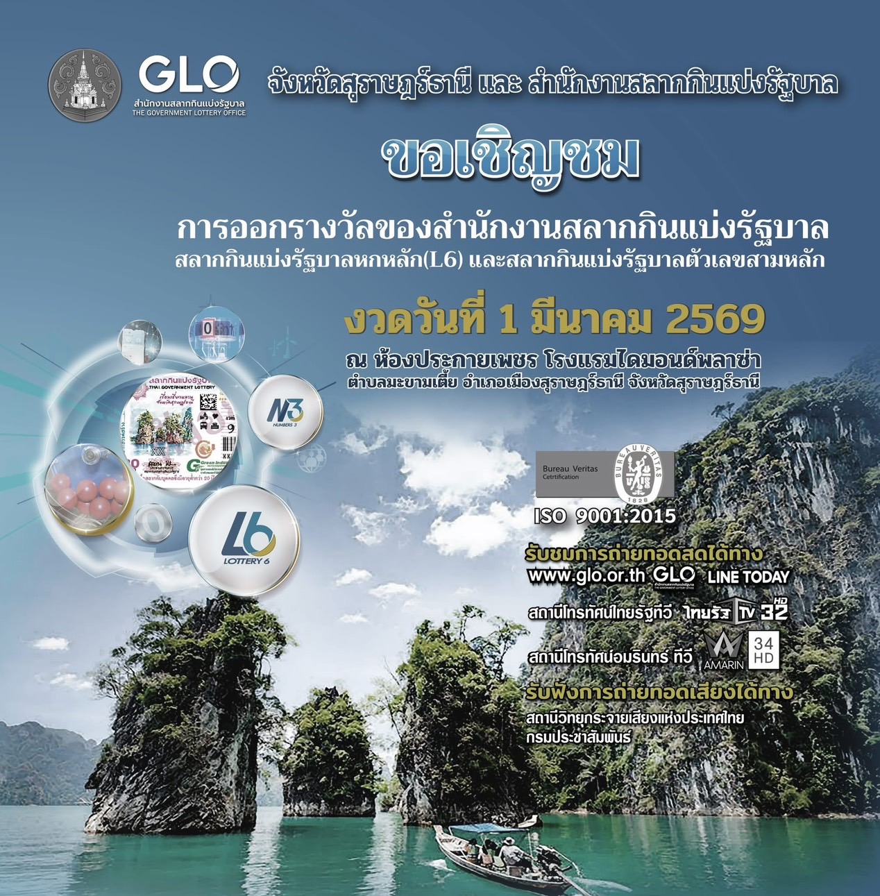 สถานีโทรทัศน์อมรินทร์ ทีวี สถานีโทรทัศน์ไทยรัฐทีวี เว็บไซต์สำนักงานสลากกินแบ่งรัฐบาล แอปพลิเคชัน “GLO Lottery official” และรับฟังการถ่ายทอดเสียงทางสถานีวิทยุกระจายเสียงแห่งประเทศไทย กรมประชาสัมพันธ์ เวลา 14.30 น. เป็นต้นไป โอกาสดีของชาวสุราษฎร์ธานีและพื้นที่ใกล้เคียง ที่จะได้สัมผัสบรรยากาศการออกรางวัลจริงแบบใกล้ชิด พร้อมร่วมเป็นส่วนหนึ่งของความโปร่งใสในทุกขั้นตอนของสลากกินแบ่งรัฐบาล งวดสำคัญต้นเดือนมีนาคมนี้