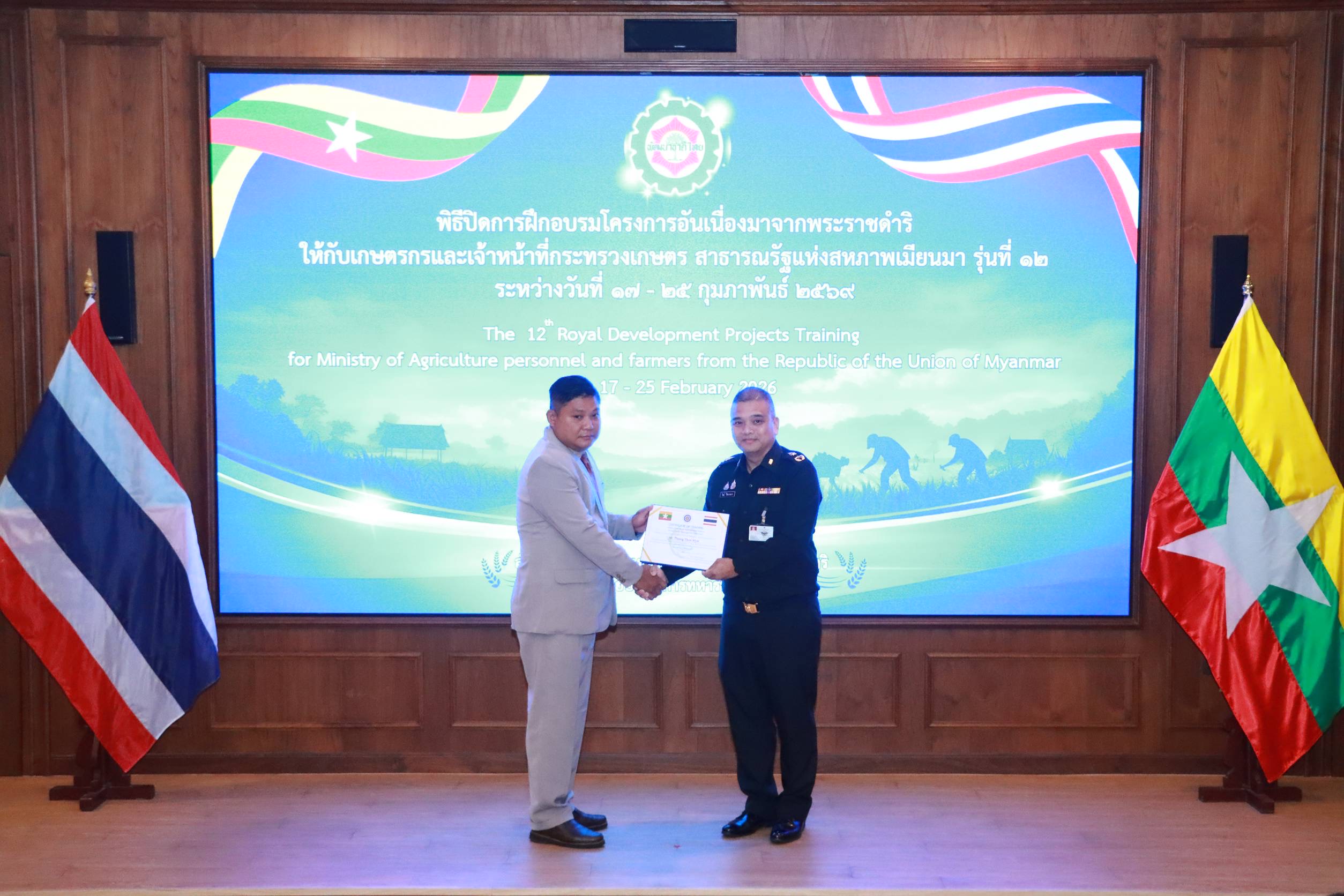 25 กุมภาพันธ์ 69 บก.ทท. (นทพ.) โดย พล.ต.วิญญ์ วิจิตรวาทการ ผอ.สนร.นทพ. เป็นประธานในพิธีปิดและมอบวุฒิบัตรการฝึกอบรมโครงการอันเนื่องมาจากพระราชดำริ รุ่นที่ 12 แก่เกษตรกรและเจ้าหน้าที่กระทรวงเกษตรจากสาธารณรัฐแห่งสหภาพเมียนมา จำนวน 14 นาย ซึ่งการฝึกอบรมจัดขึ้นในห้วงวันที่ 17 – 25 กพ.69 โดยเน้นการถ่ายทอดองค์ความรู้ทั้งภาคทฤษฎี และภาคปฏิบัติ ครอบคลุมด้านเกษตรทฤษฎีใหม่และการปศุสัตว์ ณ ศูนย์การเรียนรู้ต้นแบบระดับประเทศ อาทิ ศูนย์ศึกษาการพัฒนาเขาหินซ้อนอันเนื่องมาจากพระราชดำริ ศูนย์วิจัยข้าวปทุมธานี โครงการอนุรักษ์พันธุกรรมพืชอันเนื่องมาจากพระราชดำริ และหน่วยงานในสังกัดหน่วยบัญชาการทหารพัฒนา
