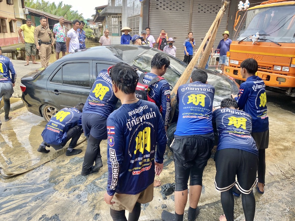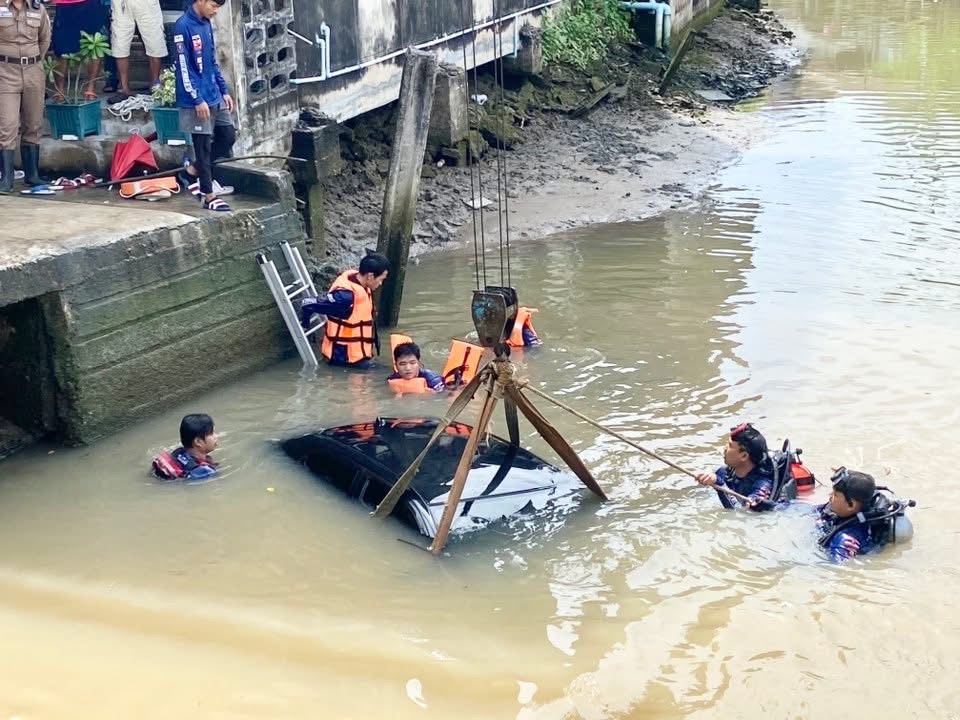 หน่วยกู้ภัยสว่างบุญช่วยเหลือธรรมสถานตราด เขตคลองใหญ่ เข้าช่วยเหลือด้วยการให้ทีมประดาน้ำลงดำน้ำเพื่อนำทรัพย์สินที่อยู่ในรถ พร้อมประสานรถเครนมายกรถขึ้นจากคลอง ใช้เวลากว่า 3 ชั่วโมง โดยพบว่ารถเสียหายหนักทั้งคัน