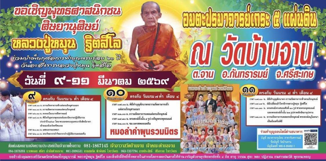 วัดบ้านจาน ต.จาน อ.กันทรารมย์ จ.ศรีสะเกษ ขอเชิญพุทธศาสนิกชน ศิษยานุศิษย์ “หลวงปู่หมุน ฐิตสีโล” ร่วมบำเพ็ญกุศลการทำบุญ ครบรอบ 23 ปี วันละสังขาร “หลวงปู่หมุน ฐิตสีโล” อมตะปรมาจารย์เถระ 5 แผ่นดิน ณ วัดบ้านจาน ในระหว่างวันที่ 9-11 มี.ค. 2569