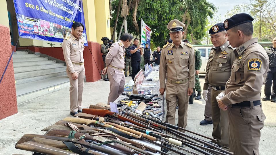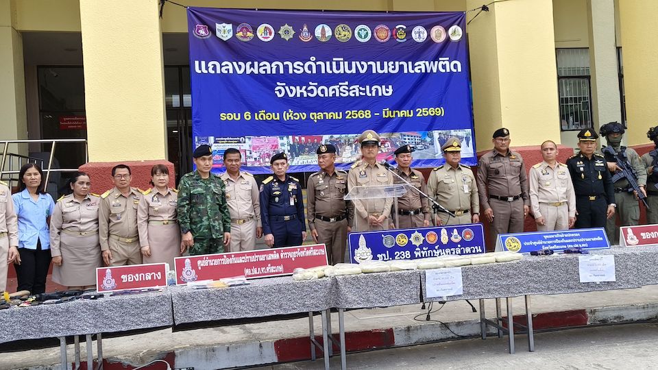 12 มีนาคม 2569 ที่หน้าศาลากลางจังหวัดศรีสะเกษ นายอนุรัตน์ ธรรมประจำจิต ผวจ.ศรีสะเกษ พร้อมด้วย พล.ต.ต.ศุภชัย ศักรินพานิชกุล ผบก.ภ.จว.ศรีสะเกษ พ.อ.สุระชัย มีหอม รอง ผอ.รมน.จังหวัดศรีสะเกษ (ท.) นายสุริยา บุตรจินดา รอง ผวจ.ศรีสะเกษ นายสะอาด วงศ์รักษ์ ปลัดจังหวัดศรีสะเกษ นายอรรถสิทธิ์ ทองแสง ผบ.เรือนจำจังหวัดศรีสะเกษ พ.ต.อ.ชยากร เทศะบำรุง รอง ผบก.ภ.จว.ศรีสะเกษ พ.ต.อ.สาธิต สถิตถาวร ผกก.สส.ภ.จว.ศรีสะเกษ พ.อ.กัญญนัต ไชยโอชะ ผบ.ฉก.ทพ.23 และพ.อ.พยัคฆพล คุ้มแสง ผบ.ฉก.3 ร่วมกันแถลงผลการจับกุมเครือข่ายคดียาเสพติด ตามยุทธการ “พิฆาตทรชนคนค้ายาอีสานใต้ ภ.3” และ “238 พิทักษ์นครลำดวน”