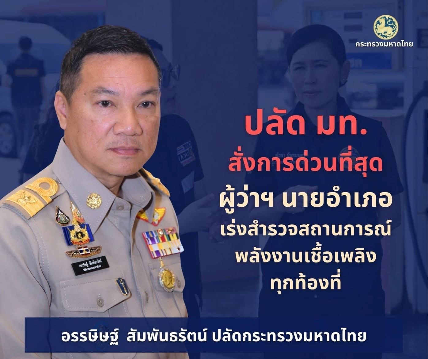 ขณะเดียวกัน กระทรวงมหาดไทยยังคงเกาะติดสถานการณ์แบบวันต่อวัน ร่วมกับกระทรวงพลังงานและกระทรวงพาณิชย์ เพื่อให้การบริหารเชื้อเพลิงเดินหน้าได้อย่างมีเสถียรภาพ ทั้งนี้ หากประชาชนพบปัญหาน้ำมันขาดแคลนหรือได้รับผลกระทบ สามารถแจ้งผ่านสายด่วนศูนย์ดำรงธรรม 1567 ได้ตลอด 24 ชั่วโมง ฟรี ไม่มีค่าใช้จ่าย.