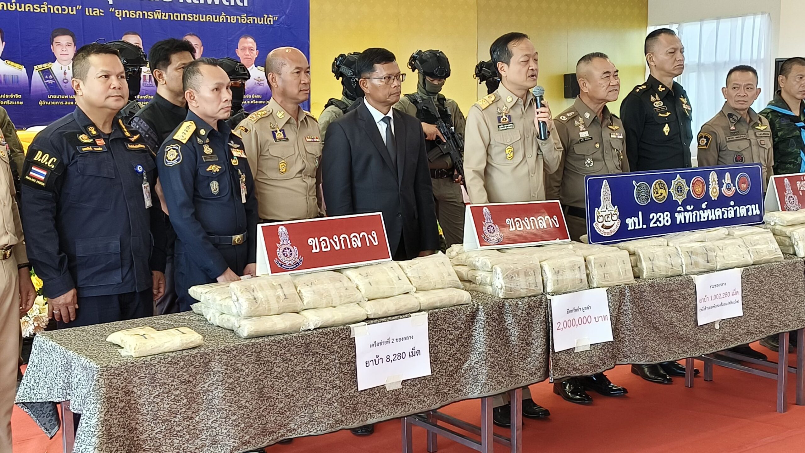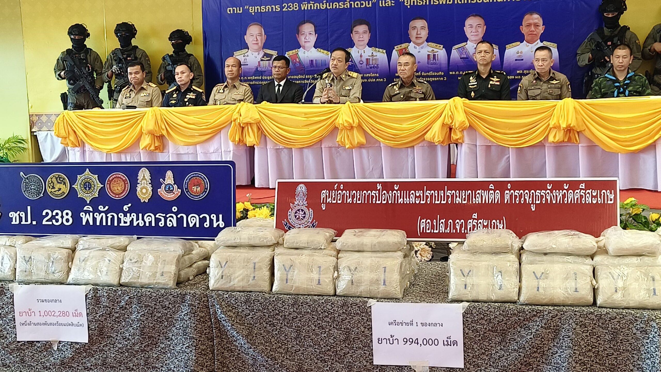 1 เมษายน 2569 ที่ ห้องประชุมอาคารเทพา ชั้น 5 ศาลากลางจังหวัดศรีสะเกษ นายอนุรัตน์ ธรรมประจำจิต ผวจ.ศรีสะเกษ พร้อมด้วย พล.ต.ต.ศุภชัย ศักรินพานิชกุล ผบก.ภ.จว.ศรีสะเกษ พ.อ.สุระชัย มีหอม รอง ผอ.รมน.จว.ศรีสะเกษ (ท.) นายสุริยา บุตรจินดา รอง ผวจ.ศรีสะเกษ หัวหน้าส่วนราชการ และหน่วยงานที่เกี่ยวข้อง ร่วมกันแถลงผลการจับกุมเครือข่ายคดียาเสพติดตามยุทธการ “พิฆาตทรชนคนค้ายาอีสานใต้ ภ.3” และปฏิบัติการ 238 พิทักษ์นครลำดวน ในห้วง 1 ต.ค. 2568 – 31 มี.ค. 2569 โดยมีผลการดำเนินงาน จับกุม 2,921 ราย ผู้ต้องหา 2,974 คน ของกลางยาบ้า 1,863,568 เม็ด ไอซ์ 699.19 กรัม คีตามีน 3 กรัม ยึดทรัพย์สินนักค้ายาเสพติด รวมมูลค่าประมาณ 44,233,093 บาท จับกุมตามหมายจับคดียาเสพติดข้อหาร้ายแรง 55 หมาย จับกุมหรือแจ้งข้อหาสนับสนุน/สมคบฯ 67 คดี จับกุมความผิด พ.ร.บ.ฟอกเงินฯ 1 คดี ผลการจับกุมเปรียบเทียบ จับกุมมากกว่าปีงบประมาณ 2568 จำนวน 521 ราย ทั้งนี้ในห้วงวันที่ 30-31 มี.ค. 2569 ชุดปราบปรามยาเสพติด ภ.จว.ศรีสะเกษ พร้อมด้วย ชุดปฏิบัติการ 238 พิทักษ์นครลำดวน ประกอบด้วย ตำรวจ,ทหาร,ฝ่ายปกครอง,เจ้าหน้าที่เรือนจำ ร่วมกันสืบสวนติดตาม จับกุม กลุ่มผู้ค้ายาเสพติดรายสำคัญ ได้ 2 เครือข่าย ผู้ต้องหา 5 คน รวมของกลางยาบ้า 1,002,180 เม็ด ยึดทรัพย์สินรวมมูลค่าประมาณ 2,000,000 บาท