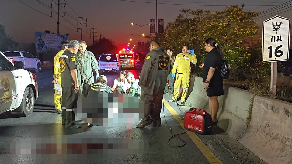 ในที่เกิดเหตุเป็นสะพานลอยที่มีความสูงจากพื้นถนนประมาณ 5 เมตร บริเวณด้านบนสะพานพบรองเท้าแตะแบบหูหนีบสีดำ 1 คู่ และขวดน้ำดื่มขนาด 1.25 ลิตร วางทิ้งไว้ 1 ขวด ส่วนบนผิวการจราจรช่องทางเลนขวาสุด พบร่างผู้เสียชีวิตเป็นชาย 1 ราย อายุประมาณ 30-40 ปี สวมเสื้อยืดคอกลมสีเทา กางเกงขาสั้นสีดำ ตรวจสอบในตัวไม่พบเอกสารทางราชการหรือเอกสารระบุตัวตน สภาพศพมีบาดแผลฉกรรจ์ที่ศีรษะและขาทั้งสองข้างหักผิดรูป