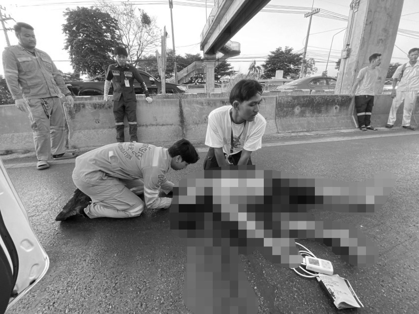 จากการสอบถาม นายปัญญา ชาตรี อาสาสมัครมูลนิธิร่วมกตัญญู (นามเรียกขาน นคร 55) เปิดเผยว่า เมื่อได้รับแจ้งเหตุและเดินทางมาถึง พบผู้เสียชีวิตนอนคว่ำหน้า มีเลือดออกที่ศีรษะจำนวนมาก เจ้าหน้าที่ได้พยายามให้การช่วยเหลือด้วยการฟื้นคืนชีพ (CPR) พร้อมประสานรถกู้ชีพจากโรงพยาบาลกรุงสยามเซนต์คาร์ลอสเข้าร่วมสนับสนุน แต่ผู้บาดเจ็บมีอาการสาหัสเกินกว่าจะยื้อชีวิตไว้ได้และเสียชีวิตในเวลาต่อมา โดยมีข้อมูลจากประชาชนที่รอรถประจำทางระบุว่า เห็นชายคนดังกล่าวเดินขึ้นไปบนสะพานลอยก่อนจะตัดสินใจกระโดดลงมาทันที