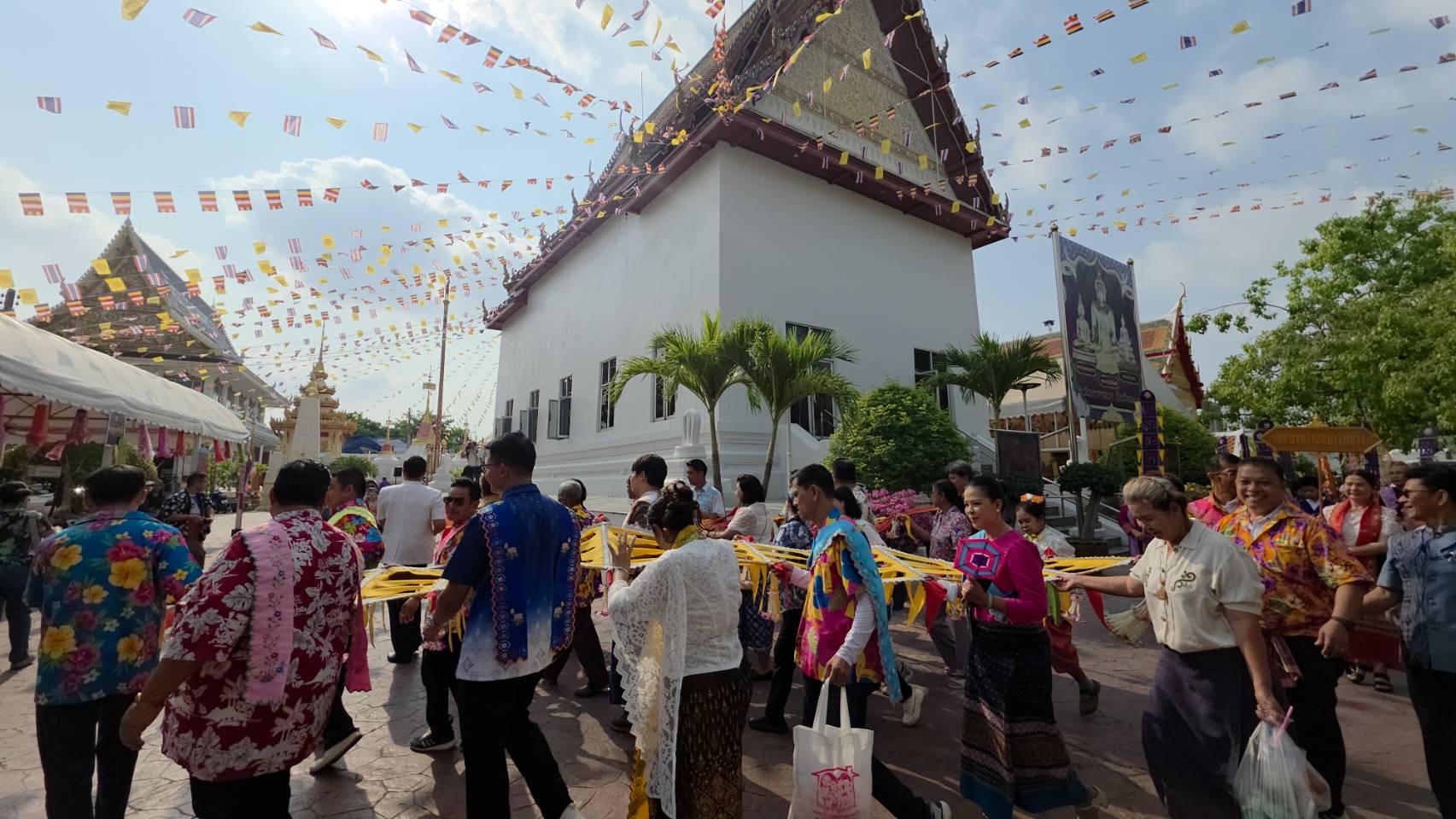 บรรยากาศภายในงานเต็มไปด้วยความวิจิตรบรรจงของขบวนแห่หงส์และธงตะขาบ ซึ่งเป็นหัวใจสำคัญของชาวมอญธงตะขาบสื่อถึงความเพียรพยายามและสติปัญญา เนื่องจากตะขาบเป็นสัตว์ที่มีเท้ามาก เปรียบเสมือนการก้าวย่างที่มั่นคงและการรวมพลังความสามัคคี เสาหงส์ สัญลักษณ์แห่งเมืองหงสาวดี ถิ่นฐานดั้งเดิมของชาวมอญที่ยังคงฝังรากลึกในจิตวิญญาณ โดยชาวบ้านได้ร่วมกันแห่ธงตะขาบผืนยาวไปรอบพระอุโบสถก่อนนำขึ้นสู่ยอดเสาหงส์ เพื่อถวายเป็นพุทธบูชา ไฮไลท์สำคัญของงานคือ พิธีห่มผ้าพระเจดีย์ทรงรามัญ 2 องค์ ที่ตั้งเด่นเป็นสง่าหน้าพระอุโบสถวัดบางหลวง ซึ่งมีความโดดเด่นทางพุทธศิลป์ ลักษณะเจดีย์ทรงชเวดากองจำลองแบบมาจากเจดีย์ชเวดากอง เมืองย่างกุ้ง มีลักษณะระฆังคว่ำทรงสูง ประดับลวดลายประณีต สื่อถึงความรุ่งเรืองสูงสุดของพระพุทธศาสนาทรงมูเตาจำลองแบบจากพระธาตุสไล (พระธาตุมุเตา) เมืองหงสาวดี มีรูปทรงเป็นเจดีย์ทรงมอญแท้ ทรงเครื่องประดับสวยงาม เป็นศูนย์รวมจิตใจของชาวมอญที่พลัดถิ่นมาตั้งรกรากในแผ่นดินไทยการห่มผ้าเจดีย์ทั้ง 2 องค์นี้ เปรียบเสมือนการถวายผ้าไตรจีวรแด่พระพุทธเจ้า ชาวบ้านจะช่วยกันแบกผ้าแถบยาวสีเหลืองทองแห่รอบเจดีย์ด้วยความศรัทธา เชื่อว่าจะส่งผลให้ครอบครัวร่มเย็นเป็นสุขและมีอายุมั่นขวัญยืน