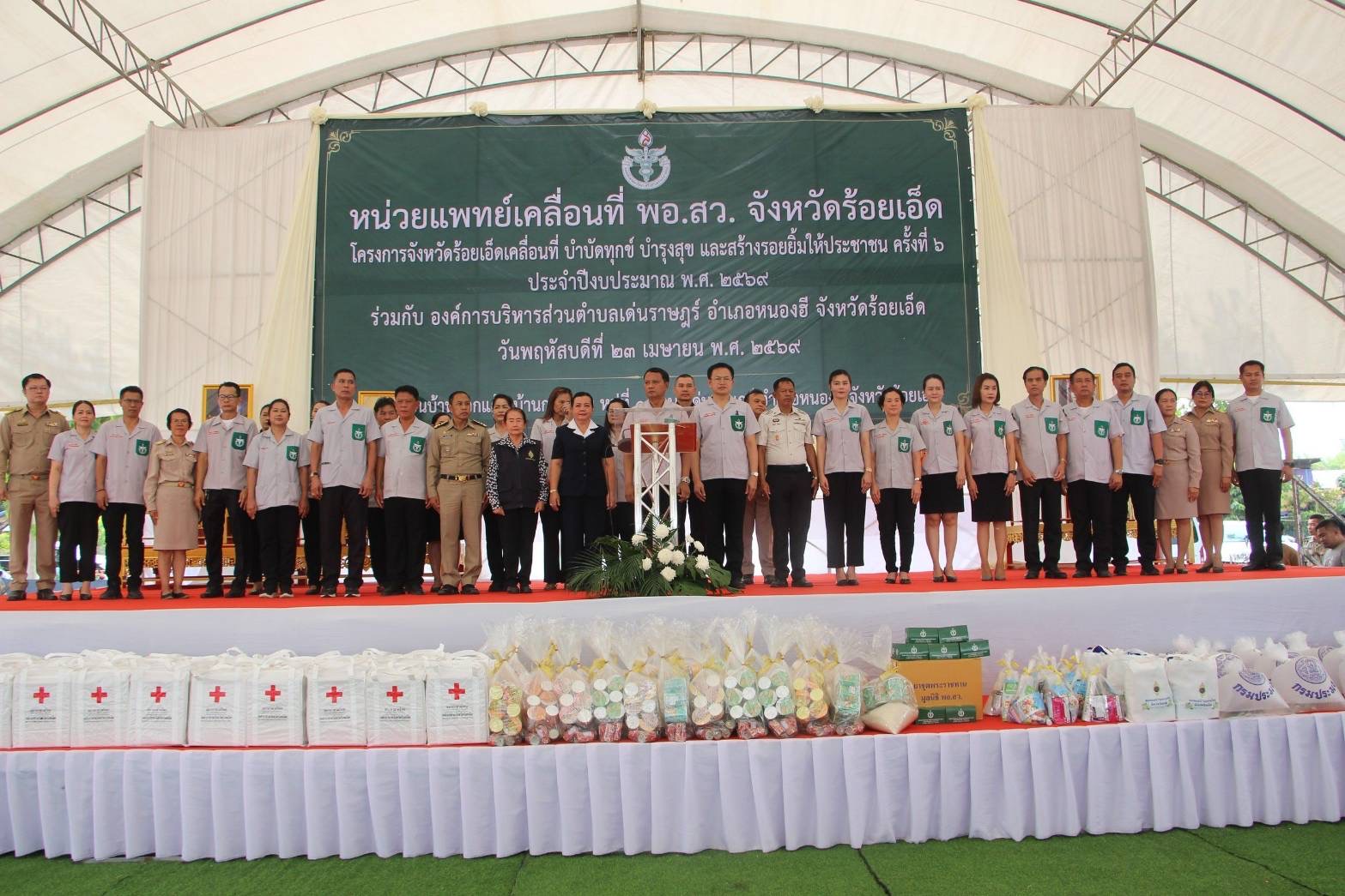 23 เมษายน 2569 ที่ โรงเรียนบ้านกอกแก้ว หมู่ที่ 1 ตำบลเด่นราษฎร์ อำเภอหนองฮี จังหวัดร้อยเอ็ด นายนันทวิทย์ นาคแสง รองผู้ว่าราชการจังหวัดร้อยเอ็ด เป็นประธานเปิดโครงการจังหวัดร้อยเอ็ดเคลื่อนที่ บำบัดทุกข์ บำรุงสุข สร้างรอยยิ้มให้ประชาชน พร้อมด้วยการออกหน่วยแพทย์เคลื่อนที่ พอ.สว. ครั้งที่ 6 ประจำปีงบประมาณ 2569 โดยมีหัวหน้าส่วนราชการ นายอำเภอหนองฮี ผู้นำท้องที่ และประชาชน เข้าร่วม