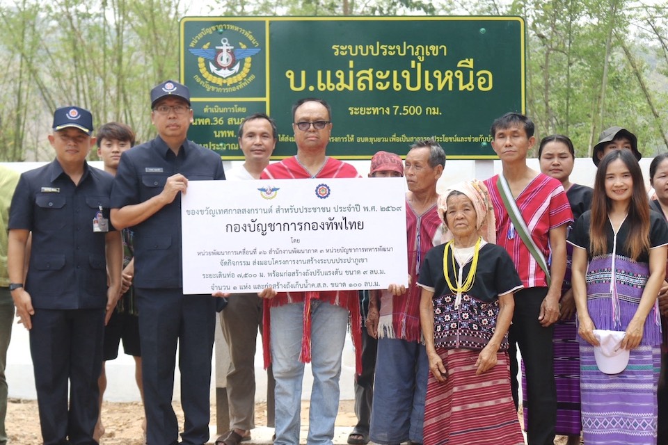 จากนั้นผู้บังคับหน่วยพัฒนาการเคลื่อนที่ 36 สำนักงานพัฒนาภาค 3 หน่วยบัญชาการทหารพัฒนา กองบัญชาการกองทัพไทย (ผบ.นพค.36 สนภ.3 นทพ.) ได้เดินทางไปส่งมอบโครงการ งานซ่อมทางผิวจราจรลูกรัง กว้าง 5 ม. ไม่มีไหล่ทาง ระยะทาง 3.000 กม.ให้ประชาชน บ.แม่สุริน ม.3 ต.ขุนยวม อ.ขุนยวม เพื่อให้ประชาชนได้ใช้เส้นทางในการสัญจรไปมาได้อย่างสะดวก เป็นการช่วยเหลือและพัฒนาคุณภาพชีวิตของประชาชน จำนวน 164 ครัวเรือน ประชากร 442 คน และส่งมอบโครงการงานสร้างระบบประปาภูเขา และก่อสร้างถังเก็บน้ำคอนกรีตเสริมเหล็ก ขนาด 100 ลบ.ม.ให้ประชาชน บ.แม่สะเป่เหนือ ม.6 ต.ขุนยวม อ.ขุนยวม เพื่อลดปัญหาการขาดแคลนน้ำอุปโภคบริโภคของประชาชนในห้วงหน้าแล้ง มีราษฎรได้รับผลประโยชน์ จำนวน 182 คน 37 ครัวเรือน อีกทั้งเป็นการสร้างความสัมพันธ์อันดีระหว่างหน่วยงานราชการ กับประชาชนในพื้นที่อีกด้วย