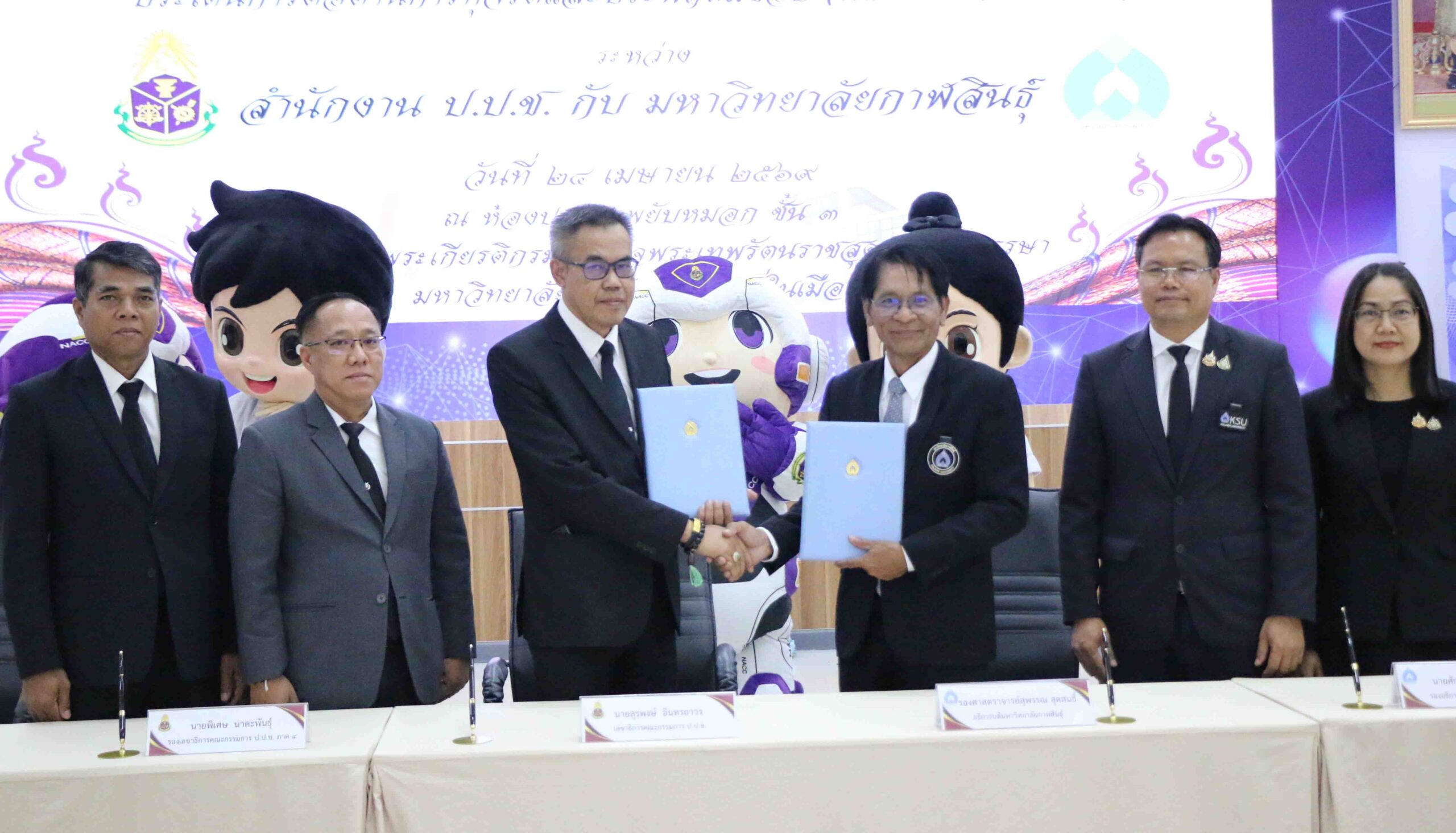 เมื่อวันที่ 24 เมษายน 2569 ที่ห้องพยับหมอก ชั้น 3 อาคารเฉลิมพระเกียรติกรมสมเด็จพระเทพรัตนราชสุดาฯ 70 พรรษา มหาวิทยาลัยกาฬสินธุ์ พื้นที่ในเมือง นายสุรพงษ์ อินทรถาวร เลขาธิการคณะกรรมการ ป.ป.ช. รองศาสตราจารย์ ดร.สุพรรณ สุดสนธิ์ อธิการบดีมหาวิทยาลัยกาฬสินธุ์ ร่วมกันลงนามในบันทึกข้อตกลง เพื่อร่วมกันในการพัฒนาความร่วมมือขับเคลื่อนแผนแม่บทภายใต้ยุทธศาสตร์ชาติ (21) ประเด็น การต่อต้านการทุจริตและประพฤติมิชอบ (พ.ศ.2561-2580) โดยการนำกฎหมาย ป.ป.ช. บรรจุเข้าในหลักสูตรการศึกษาของสาขาวิชา นิติศาสตร์