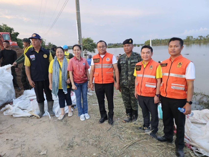 11 กันยายน 2568 เ นายชัชวาล เบญจสิริวงศ์ ผู้ว่าราชการจังหวัดร้อยเอ็ด ลงพื้นที่บ้านทรายมูล หมู่ 4 ตำบลขวาว อำเภอเสลภูมิ จังหวัดร้อยเอ็ด ติดตามสถานการณ์พนังกั้นน้ำคอนกรีตเสริมเหล็กลำน้ำยัง ที่ทรุดตัวและขาดออก ความกว้าง 5 เมตร ยาว 6 เมตร ทำให้น้ำไหลเข้าท่วมพื้นที่การเกษตรและตัดขาดเส้นทางสัญจร ซึ่งปัจจุบันได้ทำคันกั้นน้ำชั่วคราวด้วยกระสอบทรายและถุงบิ๊กแบ็ก ความยาว 15 เมตร ลึก 10 เมตร สามารถป้องกันน้ำไหลเข้าท่วมพื้นที่การเกษตรได้สำเร็จ โดยมีนายธรณิศ เทพแพงตา หัวหน้าสำนักงานป้องกันและบรรเทาสาธารณภัยจังหวัดร้อยเอ็ด พร้อมด้วยนายอำเภอเสลภูมิ ผู้นำท้องที่ท้องถิ่น และหน่วยงานที่เกี่ยวข้อง ร่วมติดตาม