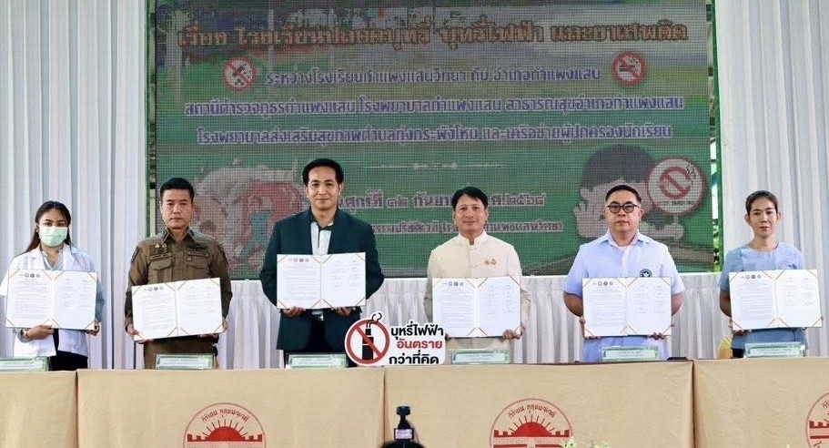 โดยมีวัตถุประสงค์เพื่อขับเคลื่อนการดำเนินงานโครงการโรงเรียนปลอดบุหรี่ บุหรี่ไฟฟ้า และยาเสพติด โดยเฉพาะการกำหนดมาตรการด้านการป้องกันการเข้าถึงและใช้บุหรี่ บุหรี่ไฟฟ้าและยาเสพติด อีกทั้งเพื่อเป็นการแสดงออกถึงเจตนารมณ์ร่วมกันในการควบคุมและป้องกันการใช้บุหรี่ บุหรี่ไฟฟ้าและยาเสพติด ให้ปรากฏผลเป็นรูปธรรม โดยมีข้อตกลงร่วมกัน ในการสนับสนุนให้มีการเผยแพร่ความรู้และรณรงค์เรื่องโทษของบุหรี่ บุหรี่ไฟฟ้า และยาเสพติด สร้างความตระหนักรู้ถึงข้อกฎหมาย และบทลงโทษต่อการกระทำความผิดเกี่ยวกับบุหรี่ บุหรี่ไฟฟ้า และยาเสพติด การสนับสนุน ส่งเสริมค่านิยมไม่สูบบุหรี่ บุหรี่ไฟฟ้า สนับสนุนการส่งต่อเด็กนักเรียน ที่ต้องการเลิกบุหรี่ บุหรี่ไฟฟ้า และยาเสพติดให้เข้าถึงบริการ การเลิกบุหรี่ บุหรี่ไฟฟ้า และยาเสพติด สนับสนุนการป้องปรามไม่ให้มีการจำหน่ายบุหรี่ บุหรี่ไฟฟ้าและยาเสพติดให้กับนักเรียนภายในชุมชน ร่วมเป็นเครือข่ายประสานความร่วมมือเฝ้าระวังการบังคับใช้กฎหมายแก่ผู้จำหน่ายบุหรี่ บุหรี่ไฟฟ้า และยาเสพติดให้กับนักเรียน โดยมีนายนรวีร์ ขันธหิรัญ นายอำเภอกำแพงแสน นายธีระ วรรณเกตุศิริ ผู้อำนวยการโรงเรียนกำแพงแสนวิทยา พ.ต.ท.ยศพงษ์ พันธุ รองผู้กำกับการป้องกันปราบปราม สภ.กำพงแสน นายอำนาจ ภูศรี สาธารณสุขอำเภอกำแพงแสน นางสาวถิรดา ปทุมสูติ นักจิตวิทยาโรงพยาบาลกำแพงแสน นางสาวปาณิสรา หนู่นุ่น ผอ.รพ.สต.ทุ่งกระพังโหม นางอัจฉรา นามวงศ์ ผู้แทนเครือข่ายผู้ปกครอง นางสาวณัฐนิช สุรสิงห์ไกรสร รองผู้อำนวยการโรงเรียนกำแพงแสนวิทยา ร่วมลงนาม MOU ในครั้งนี้ ณ โรงเรียนกำแพงแสนวิทยา ตำบลทุ่งกระพังโหม อำเภอกำแพงแสน จังหวัดนครปฐม