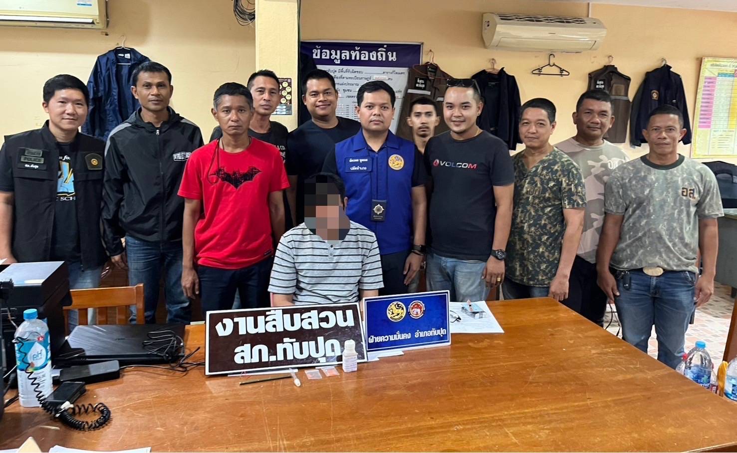 ฝ่ายปกครองอำเภอทับปุด สมาชิก อส.อ.ทับปุด ชุดสืบสวน สภ.ทับปุด ร่วมจับกุมตัว นาย ปริญญา หรือนัส อายุ 48 ปี บริเวณบ้าน ม.3 ตำบลบ่อแสน อำเภอทับปุด จังหวัดพังงา พร้อมด้วยของกลาง อุปกรณ์การเสพยาบ้า ทำด้วยหลอดไม้ไผ่ จำนวน 1 อัน อุปกรณ์การเสพไอซ์ ทำด้วยหลอดแก้ว จำนวน 1 อัน ยาบ้า บรรจุอยู่ในถุงพลาสติกใสแบบกดปิดดึงเปิด จำนวน 3 เม็ด