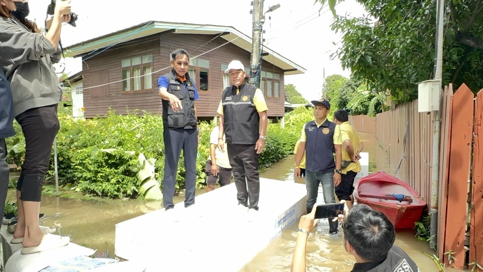 โดย พล.ต.ท.คำรณวิทย์ ธูปกระจ่าง นายก อบจ.ปทุมธานี กล่าวว่า เนื่องจากสถานการณ์น้ำเอ่อล้นริมแม่น้ำเจ้าพระยาจะเข้าท่วมขังบริเวณที่อยู่อาศัยและบ้านเรือนของประชาชนที่อยู่นอกคันกั้นน้ำ เราจึงได้มอบแพโฟมให้ เพื่อให้สามารถขนย้ายสิ่งของได้ แม้แต่ตู้เย็นก็สามารถวางได้ รถจักรยานยนต์ก็สามารถนำมาไว้บนโฟมเพื่อให้ลอยขึ้น ซึ่งพี่น้องประชาชนได้ร้องขอมาเยอะจึงรีบดำเนินการ รวมถึงได้ประสานงานกับเทศบาลท้องถิ่นที่อยู่ริมแม่น้ำ ให้รีบมารับเพื่อนำไปมอบให้พี่น้องประชาชนที่เดือดร้อน เพราะว่าเราเห็นว่าแพโฟมมีประโยชน์ต่อพี่น้องประชาชนจริง ๆ พร้อมทั้ง จัดหาเครื่องตรวจ ไฟรั่ว จากทางสถาบันเทคโนโลยีพระจอมเกล้าเจ้าคุณทหารลาดกระบัง เพื่อแจกจายให้กับ อปท. และ ประชาชนที่ถูกน้ำท่วม พร้อมฝากแจ้งประชาชนที่ใช้เรือสัญจรในแม่น้ำเจ้าพระยา ให้งดใช้ความเร็วเนื่องจากคลื่อนที่เกิดขึ้นอาจจะไปกระทบกับ ประชาชน และ กระสอบทรายที่กั้นน้ำอยู่ได้ และอยากให้ อปท.ที่มีพื้นที่ติดกับปม่น้ำเจ้าพระยา ช่วยกันดูและเรื่อง สิ่งกีดขวางการระบายน้ำ อาทิ ขยะ ผักตบชวา เป็นต้น ทางด้านสถานการณ์น้ำเราก็เฝ้าระวังอย่างใกล้ชิด โดนทาง นายนพพร ขาวขำ รองนายก อบจ.ปทุมธานี และ ร.ต.อ.ตรีลุพธ์ ธูปกระจ่าง นายกเทศมนตรีนครรังสิต ได้เฝ้าติดตามมวลน้ำด้วยดาวเทียม ซึ่งทำให้เราทราบว่าจะมีมวลน้ำฝนจาทางเหนือไหลเข้าสู้จังหวัดปทุมธานี อีกจำนวนมาก โดยเฉพาะ ช่วงวันที่ 8-13 ตุลาคมนี้ นอกจากนี้ยังเฝ้าจับตาการระบายน้ำของเขื่อนเจ้าพระยาอย่างต่อเนื่อง เมื่อวานมีการปลอยน้ำจากเขื่อนเจ้าพระยา กว่า 2,700 ลูกบาศก์เมตรต่อวินาที แต่วันนี้ ปรับลดลง เหลือ 2,400 ลูกบาศก์เมตรต่อวินาที อย่างไรก็ดีเรายังคงต้องเฝ้าติดตามเรื่องน้ำอย่างใกล้ชิด