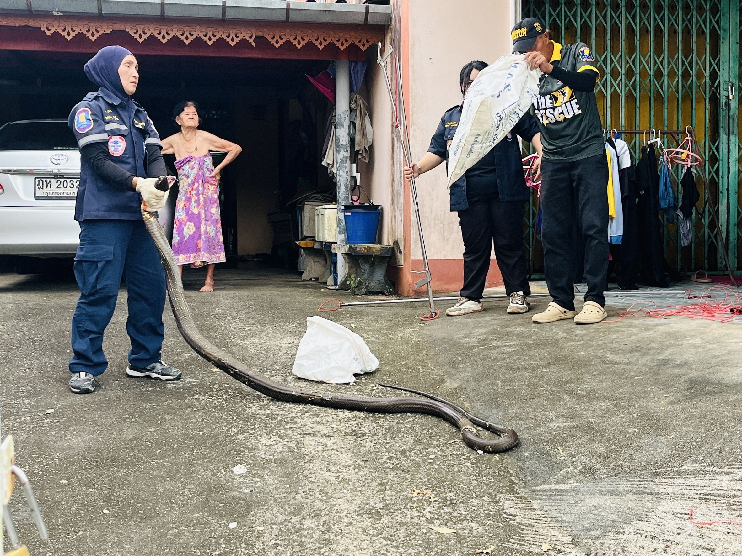 21 สิงหาคม 2568 นางศริยา จาราสถิตย์ ผู้ใหญ่บ้านหมู่ 5 บ้านบางมรวน ต.บางม่วง อ.ตะกั่วป่า จ.พังงา รับแจ้งจากนางสุภา สนจิตร อายุ 85 ปี เจ้าของบ้านเลขที่ 20/2 หมู่ 5 บ้านบางมรวน ว่าพบงูจงอางขนาดใหญ่ สีดำ ความยาวกว่า 4 เมตร นอนซ่อนอยู่ใต้ตู้เสื้อผ้าภายในบ้าน