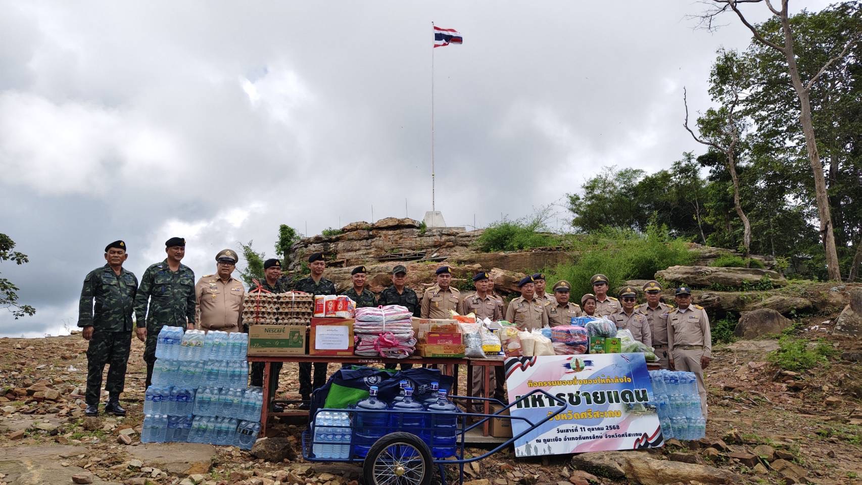 พร้อมกันนี้ คณะได้มอบสิ่งของอุปโภคบริโภคแก่เจ้าหน้าที่ทหาร ที่ปฏิบัติหน้าที่ดูแลความสงบในพื้นที่บนภูมะเขือ เพื่อเป็นขวัญและกำลังใจแก่ผู้ปฏิบัติงานในพื้นที่ห่างไกล ก่อนร่วมกันถ่ายภาพแห่งประวัติศาสตร์ความภูมิใจกับธงชาติไทยที่โบกสะบัดเหนือยอดภูมะเขือ.