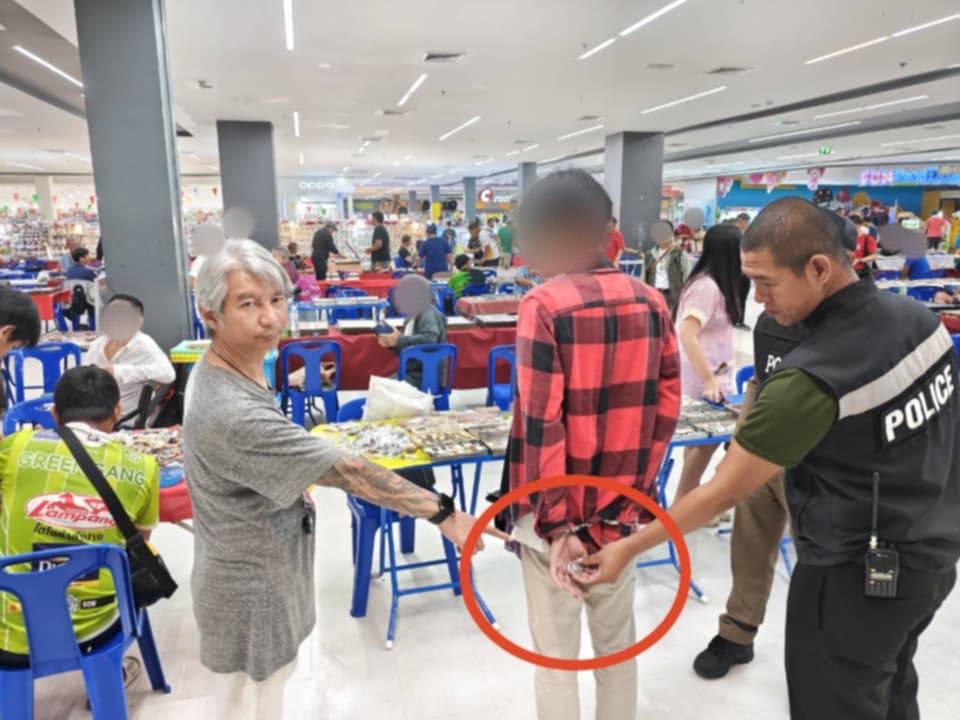 เมื่อนายธรรมนูญเจ้าของแผงพระเห็นผิดสังเกตุ นายอภิศักดิ์ผู้ก่อเหตุได้วิ่งหนีจากแผงพระเครื่อง นายธรรมนูญได้วิ่งติดตามผู้ก่อเหตุ ระหว่างนั้นได้มีเจ้าหน้าที่ตำรวจที่ทราบเหตุมาช่วยกันไล่ติดตามผู้ก่อเหตุซึ่งวิ่งหนีไปยังลานจอดรถเพื่อจะขับรถหลบหนี นายธรรมนูญ(เจ้าของแผงพระผู้เสียหาย)ได้รวบตัวนายอภิศักดิ์ได้ที่ลานจอดรถ และเจ้าหน้าที่ตำรวจได้ตามมาติดๆเข้ารวบตัวผู้ก่อเหตุได้