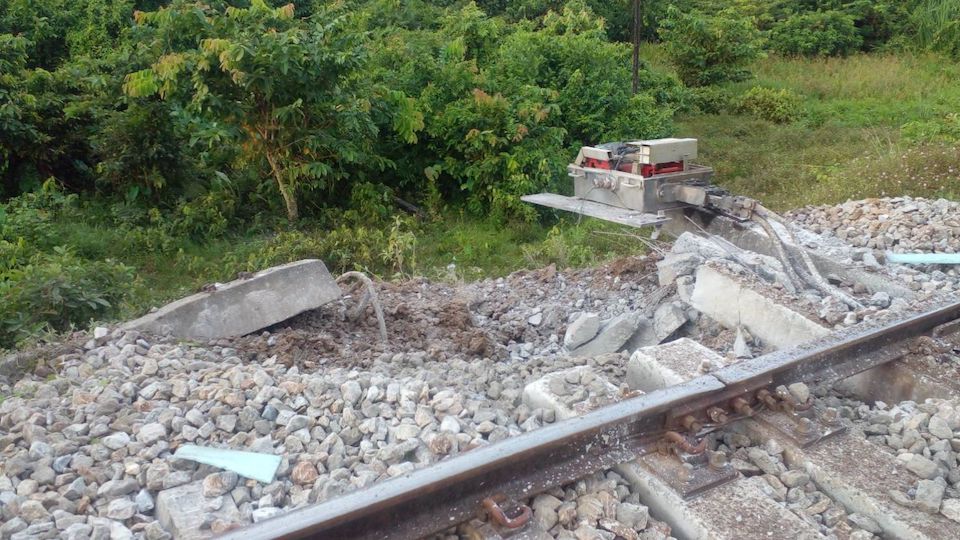 พบที่บริเวณกองหินซึ่งเป็นฐานของรางรถไฟ ห่างจากประแจสับรางเบอร์ 2 ประมาณ 2 เมตร ซึ่งเป็นจุดที่คนร้ายได้นำระเบิดแสวงเครื่องมาฝังไว้ ถูกอนุภาพของระเบิดจนกองหินกระเด็นกระจัดกระจายเป็นวงกว้างกว้าง 1 เมตร และมีหมอนคอนกรีตใช้สำหรับยึดรองรางรถไฟได้รับความเสียหาย 1 ท่อน ได้กระเด็นออกมาจากราง พร้อมทั้งมีซากเศษชิ้นส่วนของระเบิดแสวงเครื่อง ที่คนร้ายประกอบใส่ไว้ในภาชนถังแก๊สหุ้มต้ม สีเขียว ขนาดถังบรรจุ 1 ก.ก. หนัก 15 ก.ก. จุดชนวนด้วยรีโมตคอนโทรล ตกกระจายเกลื่อนพงหญ้ารกทึบริมทาง เจ้าหน้าที่จึงได้เก็บรวบรวมไว้เป็นหลักฐาน