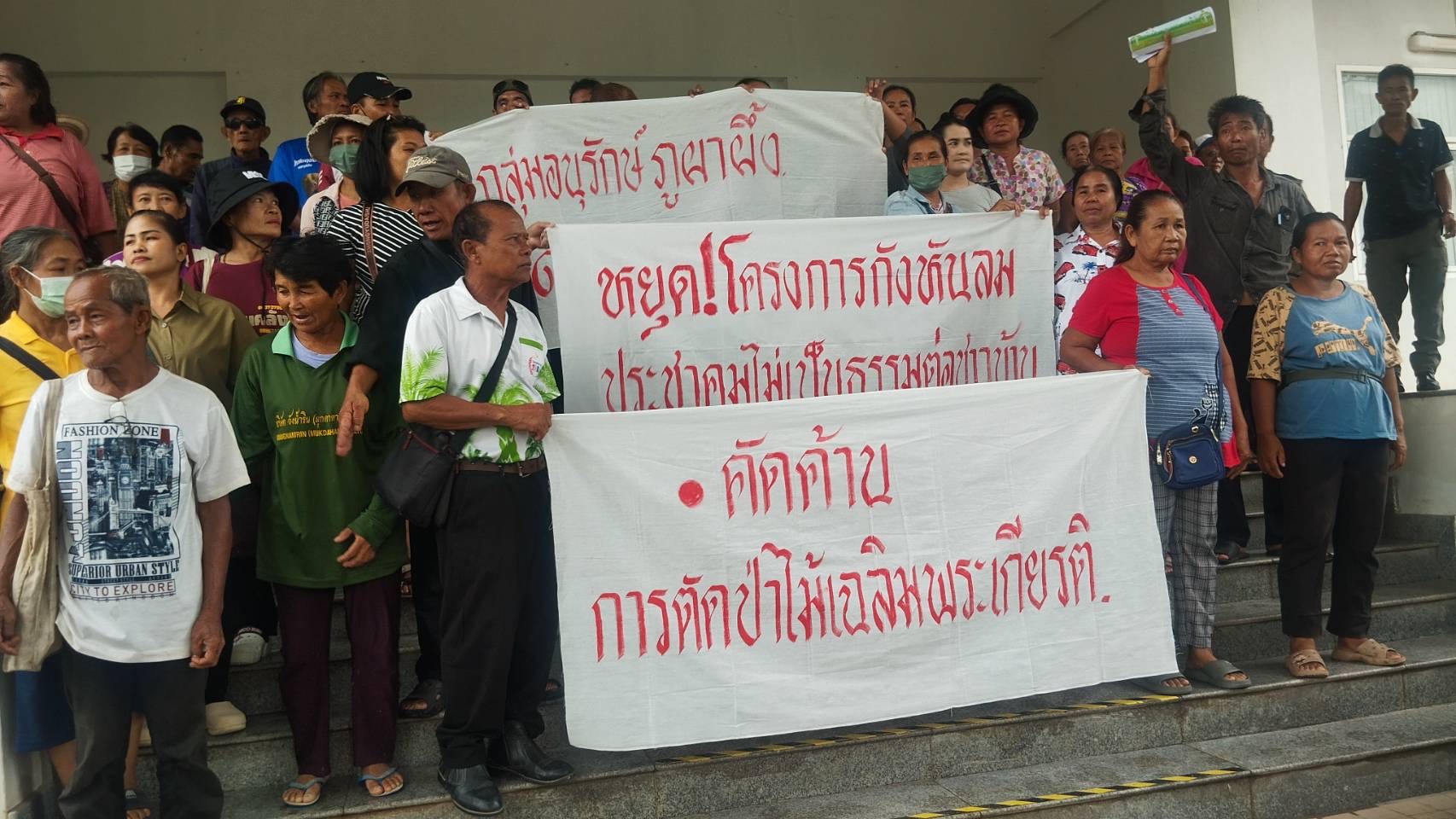 ซึ่งประชาชนบางรายยังไม่ทราบว่ามีการจัดการประชุมดังกล่าวนี้ขึ้น ทำให้การมีส่วนร่วมของประชาชนในกระบวนการดังกล่าวยังไม่เป็นไปอย่างมีประสิทธิภาพและทั่วถึง จึงขอให้ผู้ว่าราชการจังหวัดมุกดาหาร ใช้อำนาจหน้าที่ตามกฎหมายในการพิจารณามีคำสั่งระงับโครงการโรงไฟฟ้าพลังงานลมของ บริษัท อีสานพลังงานสะอาด จำกัด ไปก่อน เพื่อจัดประชุมทบทวนรับฟังความคิดเห็นของประชาชนอีกครั้ง เพื่อให้การมีส่วนร่วมของประชาชนเป็นไปโดยทั่วถึงและโครงการจะได้ดำเนินการไปอย่างโปร่งใสและเป็นประโยชน์ต่อทุกฝ่ายอย่างแท้จริง จากนั้นได้เดินทางไปยื่นหนังสือถึงผู้อำนวยการศูนย์ป่าไม้มุกดาหาร เพื่อขอยับยั้งการตัดไม้ในบริเวณภูผาผึ้ง เนื่องจากในขณะนี้ ออป. ได้ดำเนินการนำเครื่องมือและคนจำนวนหนึ่ง เพื่อทำการตัดไม้บนภูผาผึ้ง ซึ่งชาวบ้านต้องการทราบถึงขั้นตอนการดำเนินการในการเข้าตัดไม้ในพื้นที่ดังกล่าวด้วย