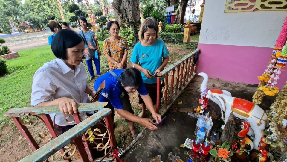 จากนั้น ชาวบ้านสายมูได้มีการเข้ากราบสักการะขอโชคกับศาลปู่ขาว ซึ่งอยู่ใต้ต้นค้อขนาดความสูง 20 เมตร อายุกว่า 100 ปี ซึ่งศาลปู่ขาว ชาวบ้านในพื้นบอกว่า ท่านเป็นเจ้าวัดเจ้าวา ที่ดูแลปกปักษ์รักษาวัดวาอาราม และคอยดูแลผู้มาปฏิบัติกิจตามหลักพระพุทธศาสนาภายในวัด โดยก่อนหน้านี้จะมีชาวบ้านในพื้นที่และต่างจังหวัด ที่มาเที่ยวชมพระอุโบสถ เรือสุวรรณหงษ์และมาทำบุญที่วัด แล้วได้มาขอโชคขอลาภ ตลอดจนเรื่องหน้าที่การงาน และเมื่อมาอธิฐานขอแล้วสำเร็จ ก็จะมาแก้บนด้วยหัวหมูบ้าง ไก่ต้มบ้าง จุดประทัดแก้บนบ้าง แต่หลักๆผู้คนจะนำมาแก้บนนั้นก็คือ จะเป็นการนำมวยมาชกแก้บน เนื่องจากปู่ขาวท่านชอบดูมวย