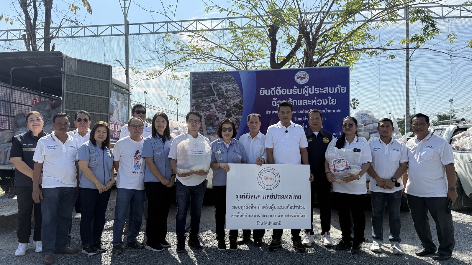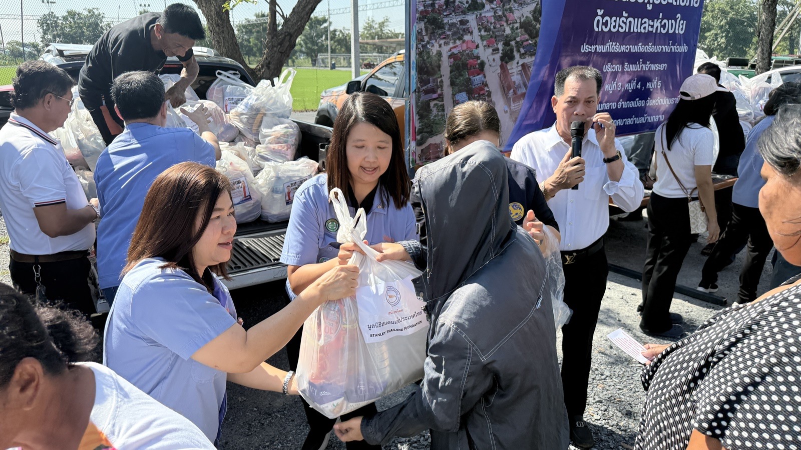 ประชาชนส่วนใหญ่ที่มารับถุงยังชีพนี้เป็นชาวบ้านที่อาศัยอยู่ติดริมแม่น้ำเจ้าพระยา ซึ่งต้องเผชิญกับภาวะน้ำท่วมขังและได้รับความเดือดร้อนอย่างต่อเนื่องมานานกว่า 2 เดือนกว่าแล้วทาง เทศบาลตำบลบ้านกลาง ร่วมกับ มูลนิธิสแตนเลย์ประเทศไทย และ นายศุภชัย นพขำ อดีต ส.ส. ปทุมธานี ได้เล็งเห็นถึงความสำคัญและความยากลำบากของพี่น้องประชาชนในพื้นที่ จึงได้เข้ามาร่วมกันมอบความช่วยเหลือบรรเทาทุกข์ในครั้งนี้