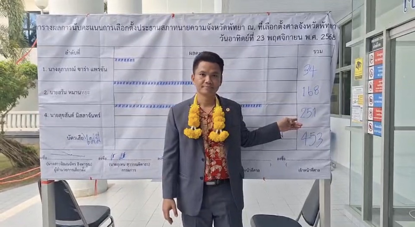 23 พฤศจิกายน 68 มีรายงานบรรยากาศเปิดหีบลงคะแนนเสียง ในการเลือกตั้งประธานสภาทนายความประจำพัทยาคนใหม่ ที่บริเวณศาลจังหวัดพัทยา โดยพบว่ามีสมาชิกพี่น้องทนายความเดินทางมาใช้สิทธิ์กันอย่างคึกคัก รวม 453 คน จากผู้มีสิทธิ์เลือกตั้งทั้งหมด 1,019 คน การเลือกตั้งประธานสภาทนายความพัทยาในครั้งนี้มีผู้ลงสมัครรับเลือกตั้งรวม 3 คน ได้แก่ หมายเลข 1 นางสาวสุภาพรณ์ (ซาร่า) แพรซัน หมายเลข 2 นายสรีน หมานหยะ และหมายเลข 4 นายสุขสันต์ มิสสาจันทร์ โดยการเลือกตั้งเป็นไปด้วยความเรียบร้อย และโปร่งใส มีสีสันความคึกคักจากกลุ่มเชียร์ผู้สมัครอย่างอบอุ่นและเป็นกันเอง