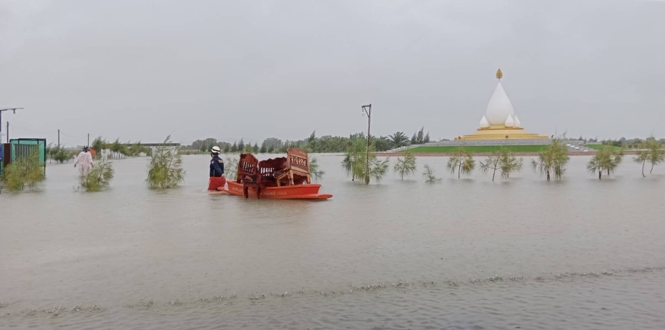 ส่วนศูนย์ปฏิบัติธรรมนานาชาติสะเดา จังหวัดสงขลา ประสบภาวะน้ำท่วมสูงสุดในรอบหลายปี น้ำเอ่อล้นถึงถนนกาญจนวนิช ท่วมพื้นที่สูงกว่า 2–3 เมตร บริเวณอาคารพักและส่วนสาธารณูปโภคได้รับความเสียหายอย่างหนัก โดยเมื่อเวลา 07.00 น. ของวันที่ 24 พฤศจิกายน พระภิกษุ 3 รูปยังคงติดอยู่ชั้นสองของกุฏิที่กำลังก่อสร้าง ไม่มีไฟฟ้า ไม่มีน้ำใช้ และยังไม่ได้รับภัตตาหาร สำหรับศูนย์อบรมเยาวชนปัตตานี ระดับน้ำเริ่มสูงขึ้นตั้งแต่ช่วงเช้ามืดวันที่ 24 พฤศจิกายน ระหว่างเวลา 02.00–03.00 น. ประกอบกับฝนที่ตกลงมาอย่างต่อเนื่องตลอดทั้งวัน ส่งผลให้ปริมาณน้ำท่วมถึงฐานเจดีย์ และกำลังขยายพื้นที่ความเสียหาย