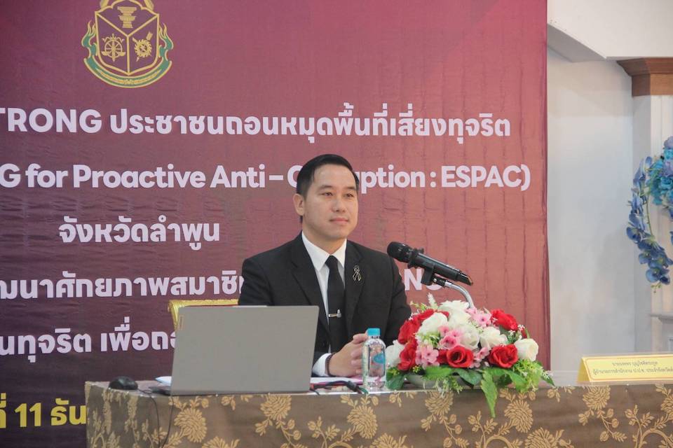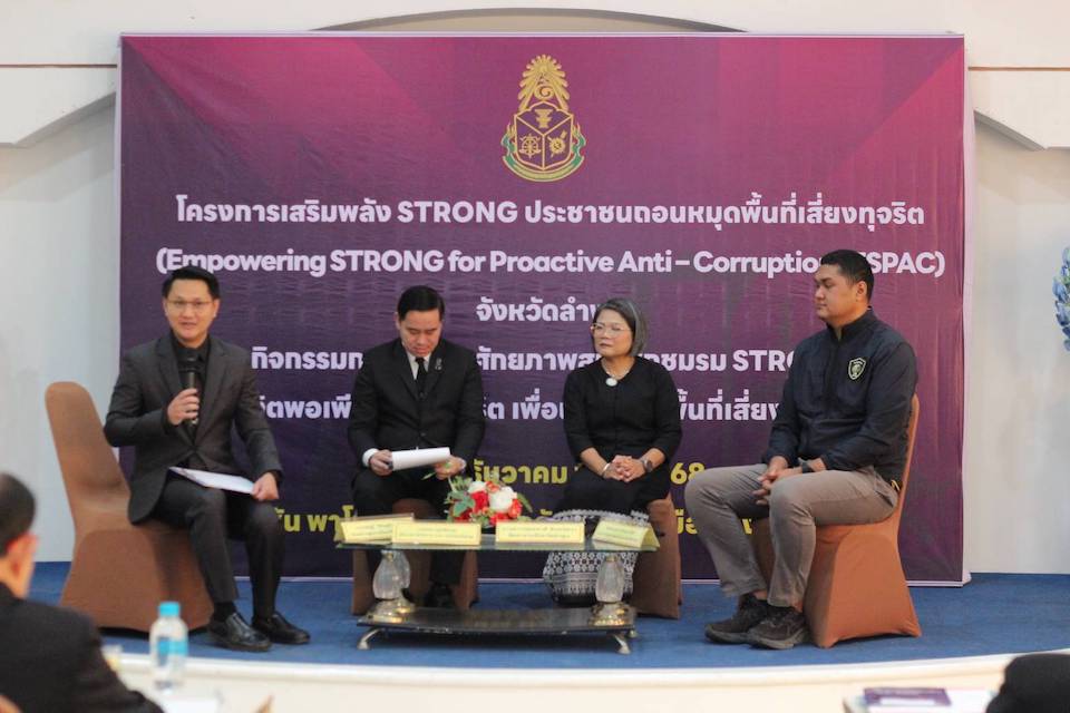 สำนักงาน ป.ป.ช. ประจำจังหวัดลำพูน จัดกิจกรรมการพัฒนาศักยภาพสมาชิกชมรม STRONG-จิตพอเพียงต้านทุจริต เพื่อถอนหมุดพื้นที่เสียงทุจริต เมื่อวันที่ 11 ธันวาคม 2568 ระหว่างเวลา 9 นาฬิกา ถึง 15 นาฬิกา ณ โรงแรมกัซซัน พาโนราม่า กอล์ฟ คลับ ตำบลมะเขือแจ้ อำเภอเมือจังหวัดลำพูน โดยมี นายนพพร บุญโชติตระกูล ผู้อำนวยการสำนักงานป้องกันและปราบปรามการทุจริตแห่งชาติ (ป.ป.ช.) ประจำจังหวัดลำพูน เป็นประธานเปิดงานฯ มีการเสวนาแลกเปลี่ยนเรียนรู้ หัวข้อ “มาตรการป้องกันการทุจริตในกระบวนการบริหารจัดการแรงงานข้ามชาติ” ต่อจากนั้น มีการบรรยาย หัวข้อ “การดำเนินการจัดซื้อจัดจ้างผลิตภัณฑ์และบริการในบัญชีนวัตกรรม พร้อมกรณีศึกษาในจังหวัดลำพูน” โดย นางโสมฤทัย คำราพิช นักวิชาการคลังชำนาญการพิเศษ สำนักงานคลังจังหวัดลำพูน และคณะฯ เรื่อง มาตรการป้องกันการทุจริตในกระบวนการบริหารจัดการแรงงานข้ามชาติ โดย สำนักงาน ป.ป.ช. ซึ่งกิจกรรมครั้งนี้ จึงมุ่งเน้นให้เครือข่าย STRONG ลำพูน ร่วมกัน ถอนหมุดพื้นที่เสี่ยงทุจริต – เปิดพื้นที่โปร่งใส – ไม่ทนต่อการทุจริตทุกรูปแบบ เพื่อสร้างระบบที่ตรวจสอบได้และมีส่วนร่วมจากประชาชนอย่างแท้จริง