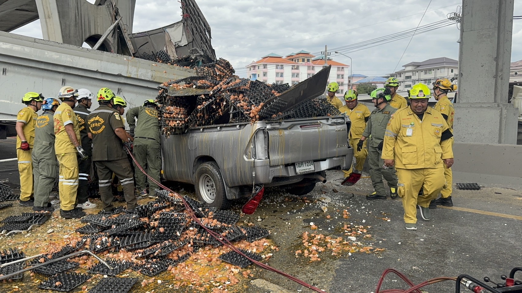 จากการสอบถาม นายนภัทร กลมเกลี้ยง เจ้าหน้าที่กู้ภัยมูลนิธิร่วมกตัญญู กล่าวว่า การให้ความช่วยเหลือต้องใช้รถเครนมายกตัวคานสะพานลอยออกก่อน เนื่องจากมีน้ำหนักมาก ถ้าไปตัดถ่างหัวรถพ่วงฯ เกรงว่าคานจะหล่นลงมาทับร่างของผู้บาดเจ็บที่ติดอยู่ภายในได้ เบื้องต้นยืนยันเสียชีวิตหนึ่งรายเป็นคนขับรถกระบะบรรทุกไข่ และบาดเจ็บสาหัสหนึ่งรายเป็นคนขับรถบรรทุกพ่วงฯ