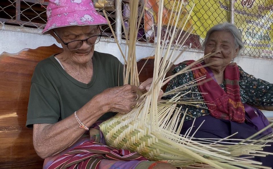นายอุทัย กิ่งบู อายุ 85 ปี ชาวบ้านโนนสังข์ อ.กันทรมย์ ชาวบ้านคนข้างเคียงกับศูนย์ผู้พักพิง ได้มาสานฮวดนึ่งข้าวให้ผู้พังพืงดู เผื่อใครสนใจจะนำไปทำใช้ที่บ้านก็ยินดีสอนให้ ถ้าขายก็ขายใบละ 30 บาทเท่านั่นเอง.