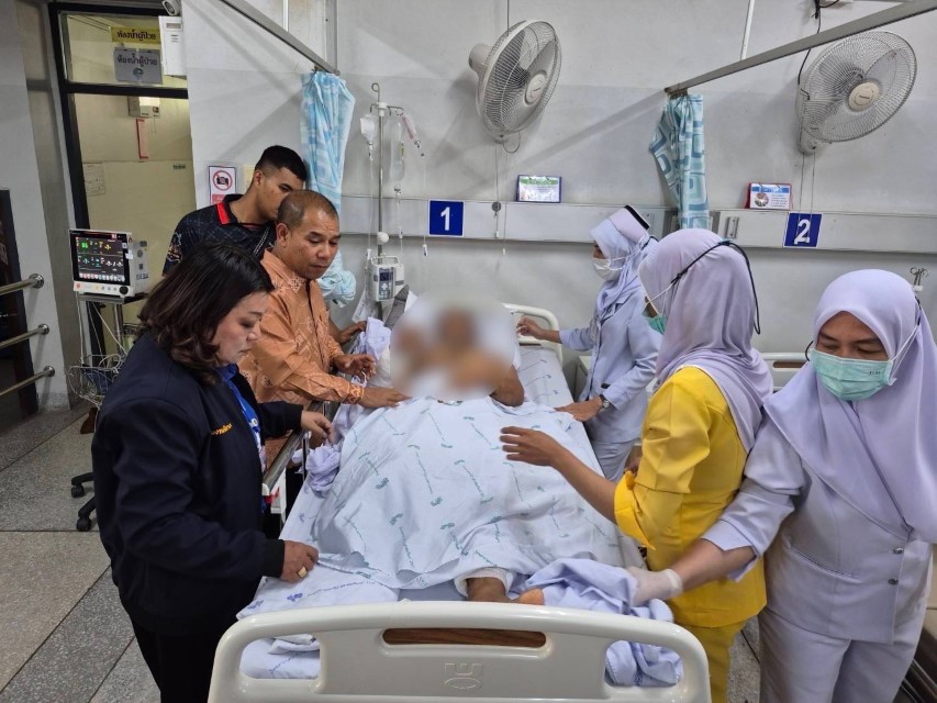 29 สิงหาคม 2568 ที่ โรงพยาบาลนราธิวาสราชนครินทร์ อำเภอเมืองนราธิวาส จังหวัดนราธิวาส นายแพทย์ สมหมาย บุญเกลี้ยง ผู้ช่วยเลขาธิการ ศอ.บต. พร้อมด้วยเจ้าหน้าที่กลุ่มงานเยียวยา ศอ.บต. และศูนย์ปฏิบัติการช่วยเหลือเยียวยาจังหวัดนราธิวาส / อำเภอ เข้าเยี่ยม นายอาซือมิง อาแซ อายุ 53 ปี ผู้ได้รับบาดเจ็บจากเหตุเหยียบกับระเบิดที่คนร้ายได้วางไว้ บริเวณเหมืองแร่ หมู่ที่ 3 บ้านไอร์ซือเร๊ะ ตำบลช้างเผือก อำเภอจะแนะ จังหวัดนราธิวาส ทำให้ได้รับบาดเจ็บบริเวณข้อเท้าขาขวาขาด ขาข้างซ้าย และแขนข้างขวาเป็นแผลฉีกขาด แพทย์ได้ทำการผ่าตัดใต้เข่าขาข้างขวา และตกแต่งบาดแผลเรียบร้อยแล้ว ขณะนี้ผู้บาดเจ็บ รู้สึกตัวและพ้นขีดอันตราย