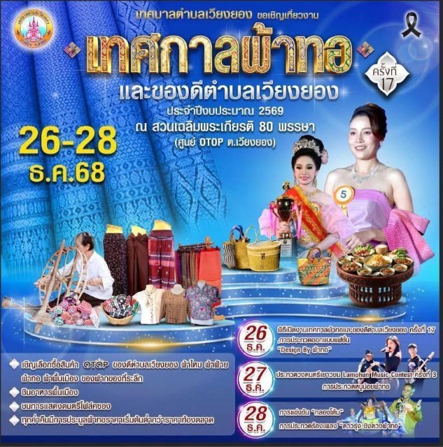 26 ธันวาคม 2568 นางสาวเบญจวรรณ มีเผือก รองผู้ว่าราชการจังหวัดลำพูน เป็นประธานในพิธีเปิดงานเทศกาลผ้าทอและของดีตำบลเวียงยอง ครั้งที่ 17 ประจำปีงบประมาณ 2569 จัดขึ้นระหว่างวันที่ 26 – 28 ธันวาคม 2568 ณ สวนเฉลิมพระเกียรติ 80 พรรษา (ศูนย์ OTOP) ตำบลเวียงยอง อำเภอเมือง จังหวัดลำพูน โดยมีกิจกรรมสำคัญ ได้แก่ แฟชั่นโชว์ “ชุดผ้าทอ” การประกวดออกแบบแฟชั่น Design By ผ้าทอ การประมูลผ้าทอในราคาต่ำกว่าท้องตลาด และพิธีมอบรางวัลการประกวดออกแบบแฟชั่น Design By ผ้าทอ ในพิธีมีผู้ร่วมงานจำนวนมาก อาทิ นางณัษฐพร ชูวงศ์ นายกเหล่ากาชาดจังหวัดลำพูน/ประธานแม่บ้านมหาดไทยจังหวัดลำพูน นายวีระเดช ภู่พิสิฐ นายกองค์การบริหารส่วนจังหวัดลำพูน หัวหน้าส่วนราชการระดับจังหวัดและอำเภอ ผู้แทนเหล่ากาชาดจังหวัดลำพูน ผู้ประกอบการผ้าทอ กำนัน ผู้ใหญ่บ้าน ประชาชน และนักท่องเที่ยว เข้าร่วมงานอย่างคึกคัก