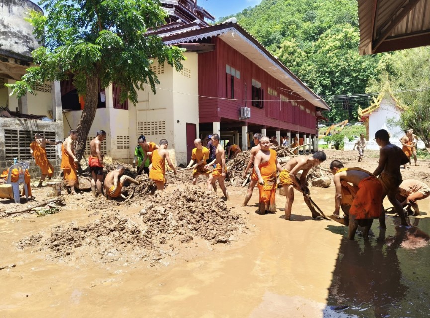 29 สิงหาคม 2568 พระครูอนุกูลศีลสังวร เจ้าอาวาสวัดผาบ่องใต้ เจริญพรขอบคุณ คณะพระสงฆ์ สามเณร โรงเรียนวัดพระธาตุดอยกองมู วัดจองกลาง วัดภูสมณาราม ร่วมบูรณาการกับหลายภาคส่วนในจังหวัดแม่ฮ่องสอน ได้แก่ ทีมเจ้าหน้าที่ ตชด.336 (ปางหมู) ทีมเจ้าหน้าที่ อส.จังหวัดแม่ฮ่องสอน ทีมงานองค์การบริหารส่วนจังหวัดแม่ฮ่องสอน เทศบาลเมืองแม่ฮ่องสอน สำนักงานวัฒนธรรมจังหวัดแม่ฮ่องสอน พร้อมด้วยคณะศรัทธาบ้านห้วยเดื่อ ร่วมกันทำความสะอาด เคลียร์พื้นที่ประสบอุกทกภัย บริเวณวัดผาบ่องใต้ บ้านผาบ่อง ตำบลผาบ่อง อ.เมือง จ.แม่ฮ่องสอน ที่ได้รับความเสียหายจากเหตุอุทกภัย น้ำป่าไหลหลาก เหตุพายุคาจิกิ ถล่มเมืองแม่ฮ่องสอน ได้รับความเสียหายอย่างหนัก เมื่อวันที่ 27 สิงหาคม 2568 ที่ผ่านมา