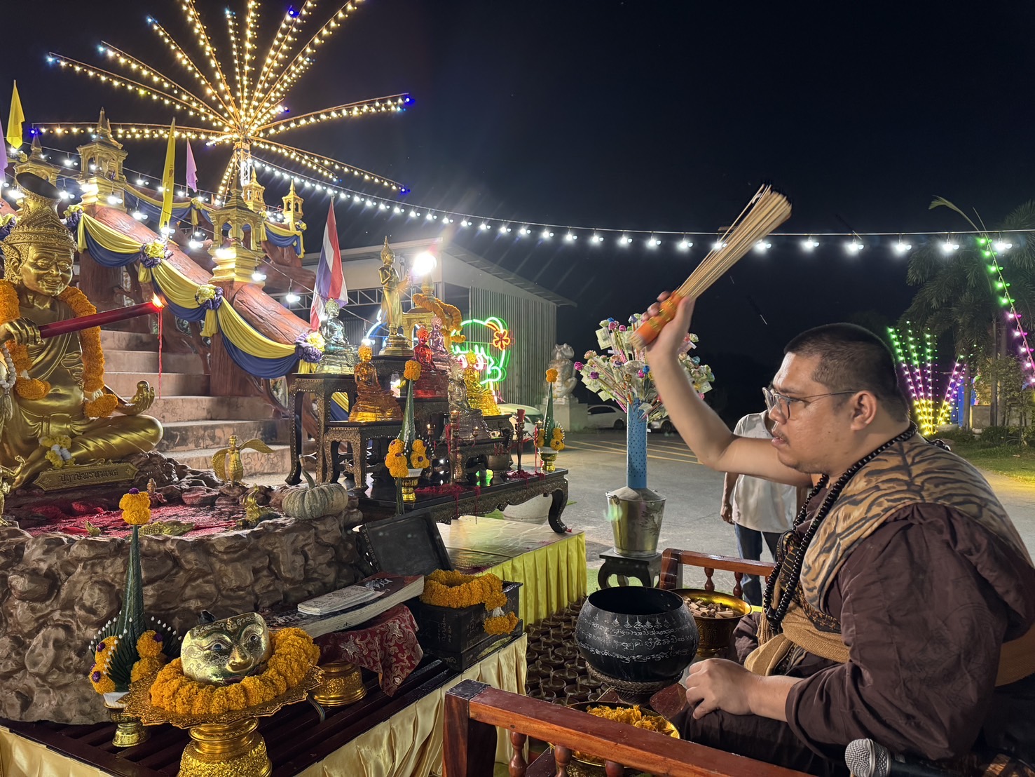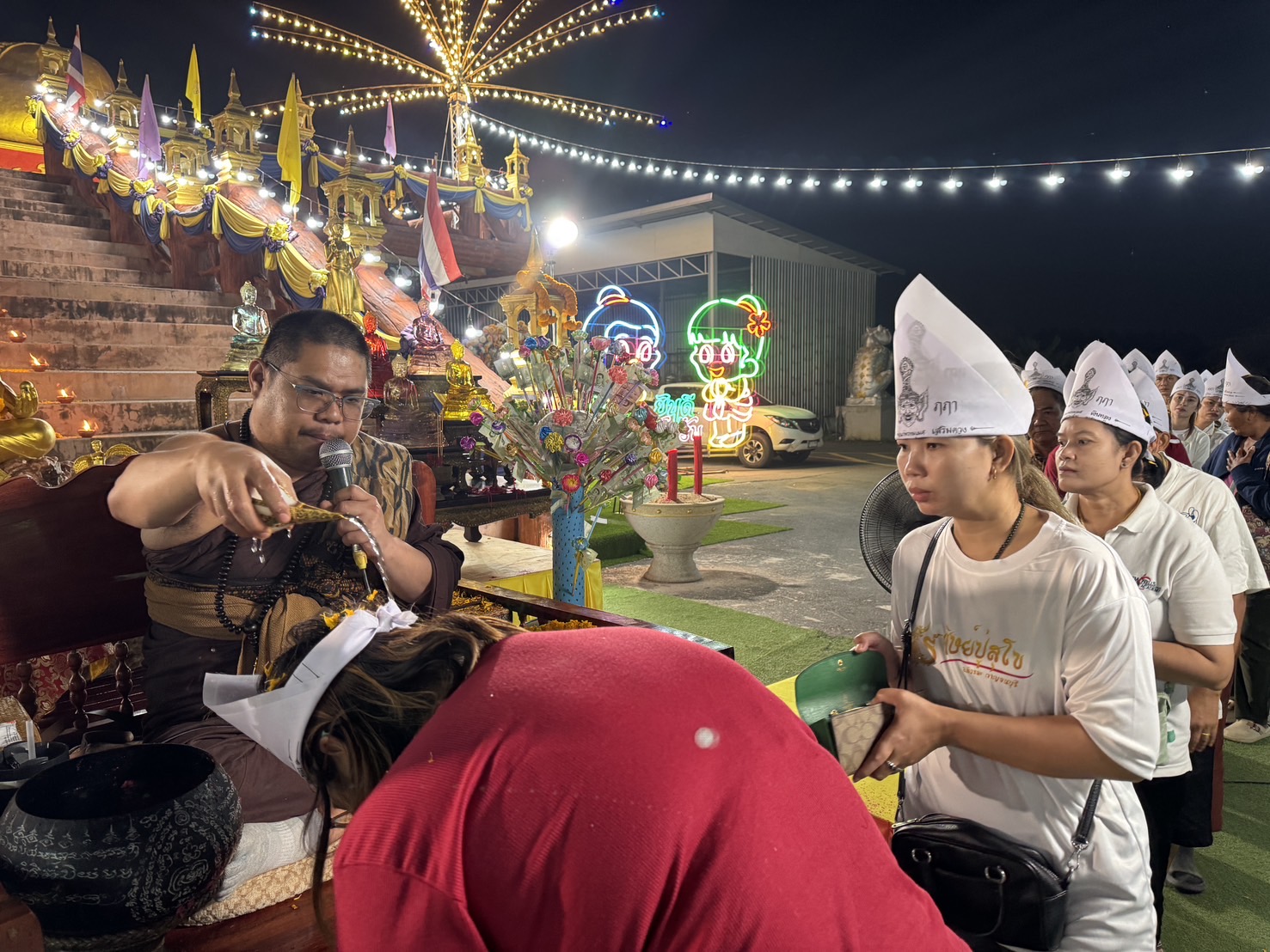 ในเวลา 23.30 น. อาจารย์ฤาษีเณรได้นำสวดมนต์จนถึงเวลาเที่ยงคืน ก็ได้รดน้ำมนต์แก่ประชาชนที่มาร่วมงานผ่านมหาสังข์เวียนขวาซึ่งเป็นของหายากราคาหลักล้านเพราะสังข์ปกติจะเวียนด้านซ้ายและยังมอบต่อเงินต่อทองที่เป็นเครื่องรางเรียกโชคคลาภแก่ประชนทุกคนที่มาร่วมพิธีอีกด้วย