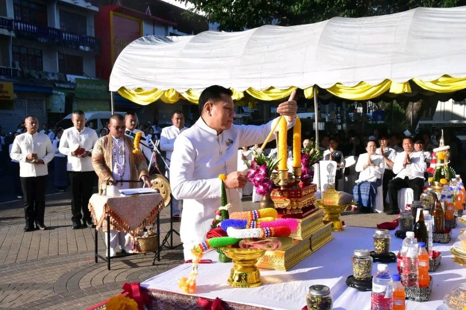 จากนั้นประธานในพิธีได้ถวายเครื่องบวงสรวง ผูกผ้านุ่งสีแดงและผ้า 7 สี ถวายพวงมาลัยเจ้าพ่อหลักเมือง สรงน้ำพระพุทธมนต์ ถวายน้ำหอม และประพรมเจ้าพ่อหลักเมือง ถือเป็นอันเสร็จสิ้นพิธี ท่ามกลางบรรยากาศแห่งความศรัทธาและความเป็นสิริมงคล เพื่อความสำเร็จของการจัดงานกาชาดและงานของดีจังหวัดมุกดาหาร ประจำปี 2569 ต่อไป